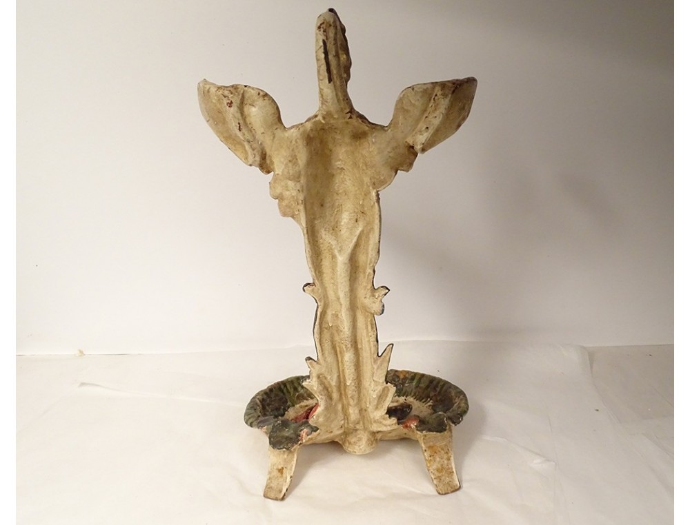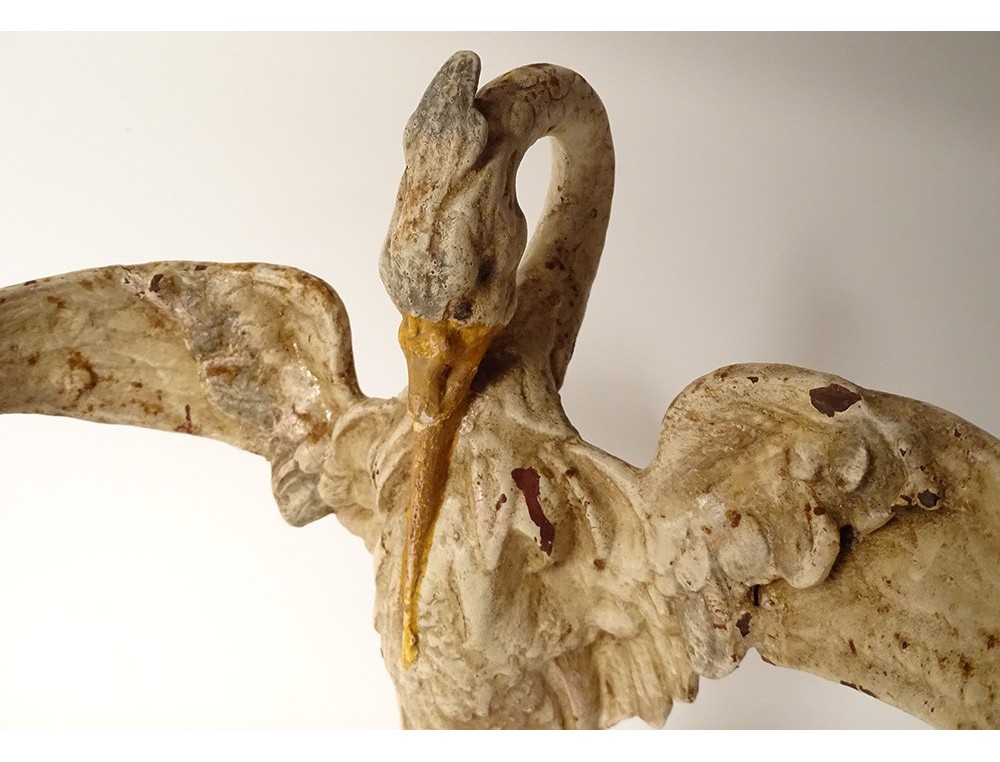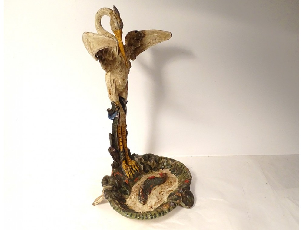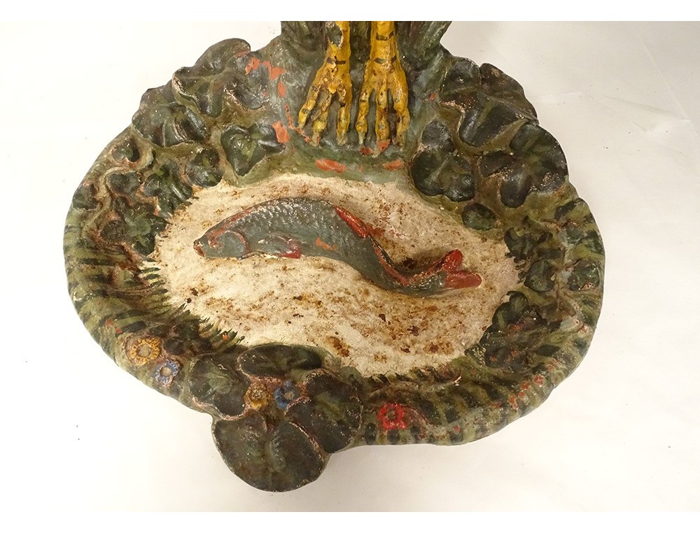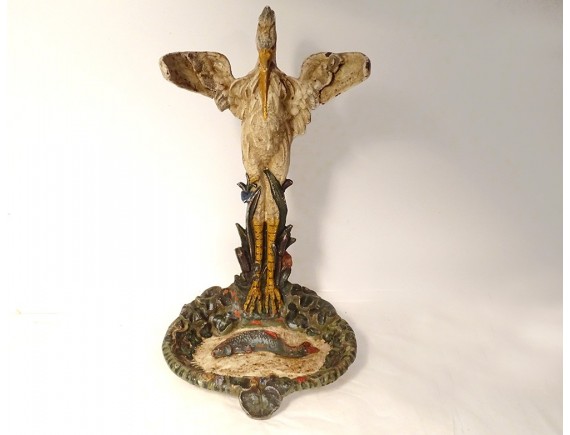Polychrome cast iron umbrella stand, representing a heron with outstretched and curved wings (to hold umbrellas), looking towards the pond-shaped receptacle in which a fish swims, from the Art Nouveau period, late 19th century.