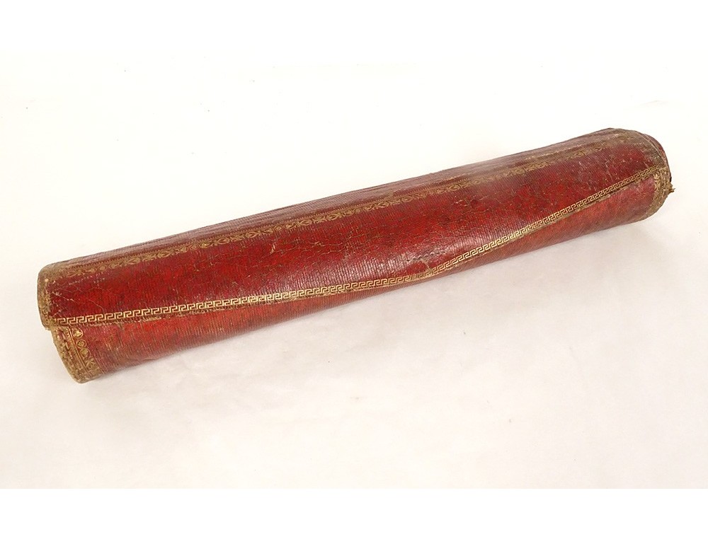 Country writing wallet, with cylindrical case, in iron-gilded red morocco leather, decorated with fine stylized friezes, interior and case in green leather, from the First Empire period at the beginning of the 19th century.