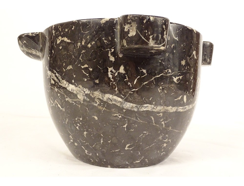 Large apothecary mortar in black veined marble, with four ears, from the 19th century.