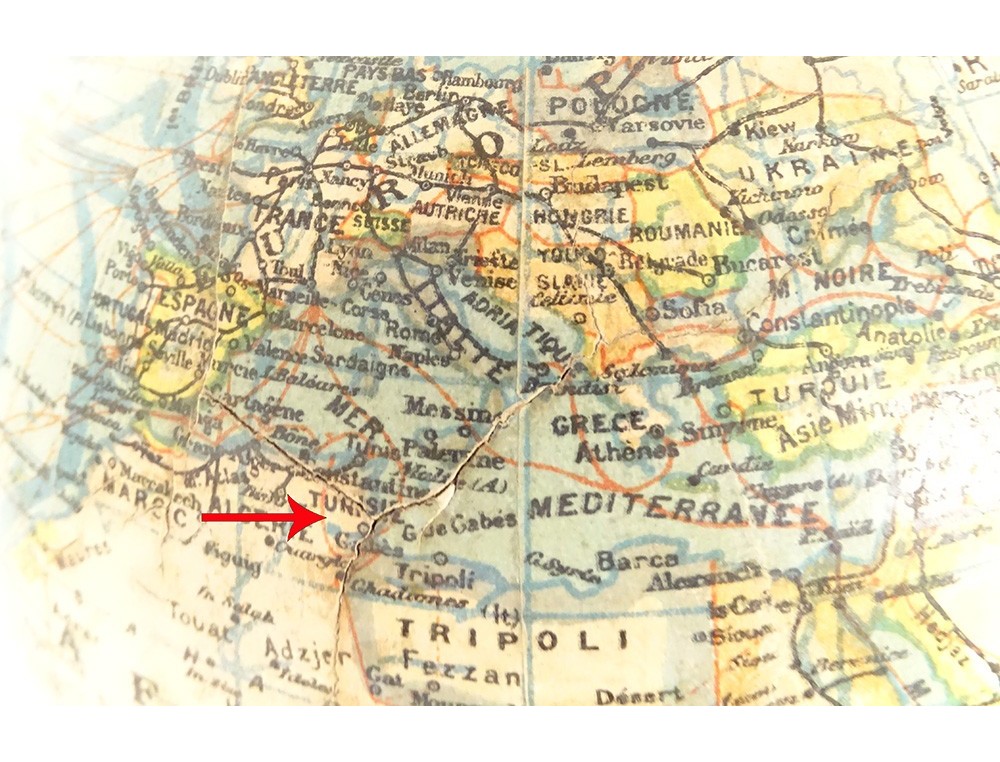 Please note: some slight accidents on the globe, a crack (see red arrow), some stains and yellowing, some wear on the wooden base, wear from time, see photos (see red arrows).