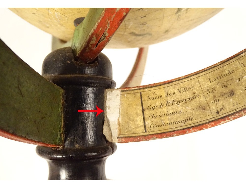 Please note: some accidents on the globe, accident on the ring at the top of the meridian, an arm is slightly dislocated from below (see red arrow), some scratches on the globe, wear and tear, look carefully at the photos for details.