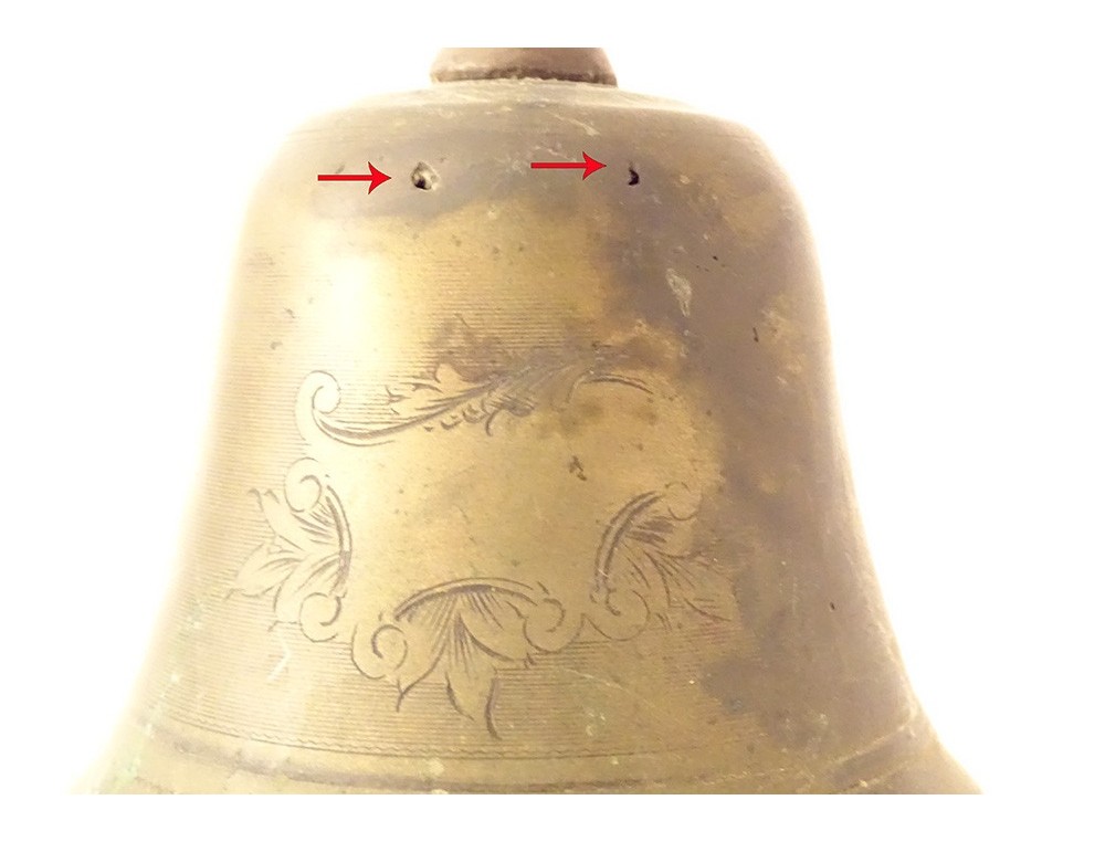 This bell is in good general condition. It rings very well despite a few holes in the body.
