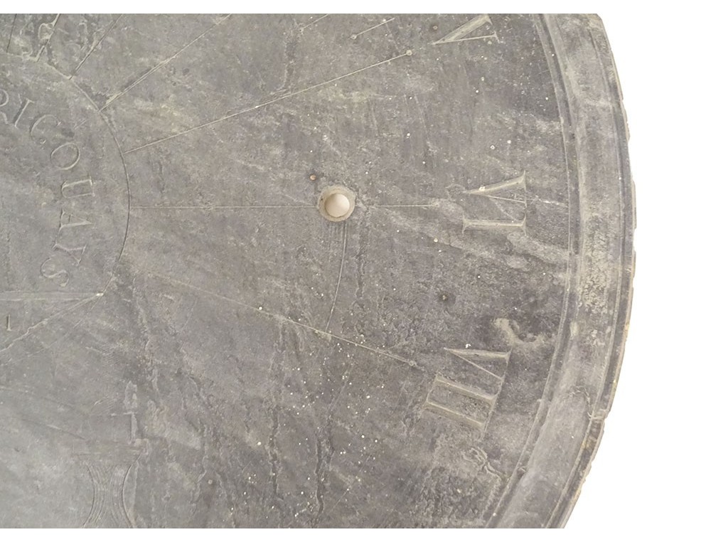Round slate sundial, engraved Jean Baptiste Picouays and dated 1831 in the center, from the 19th century.