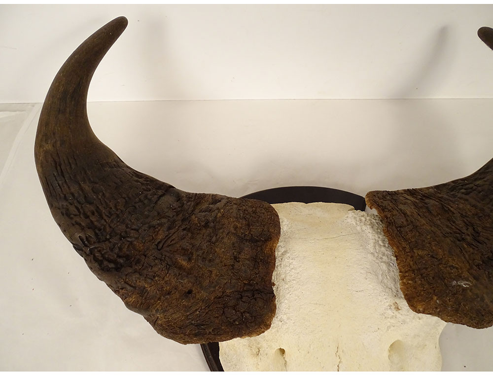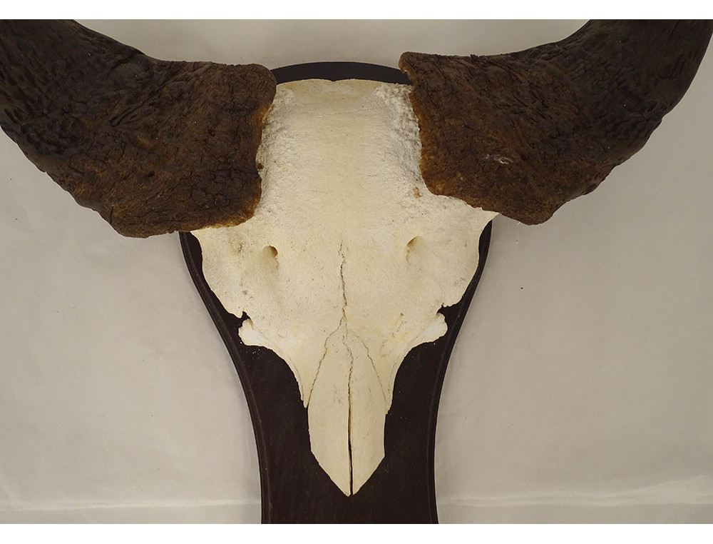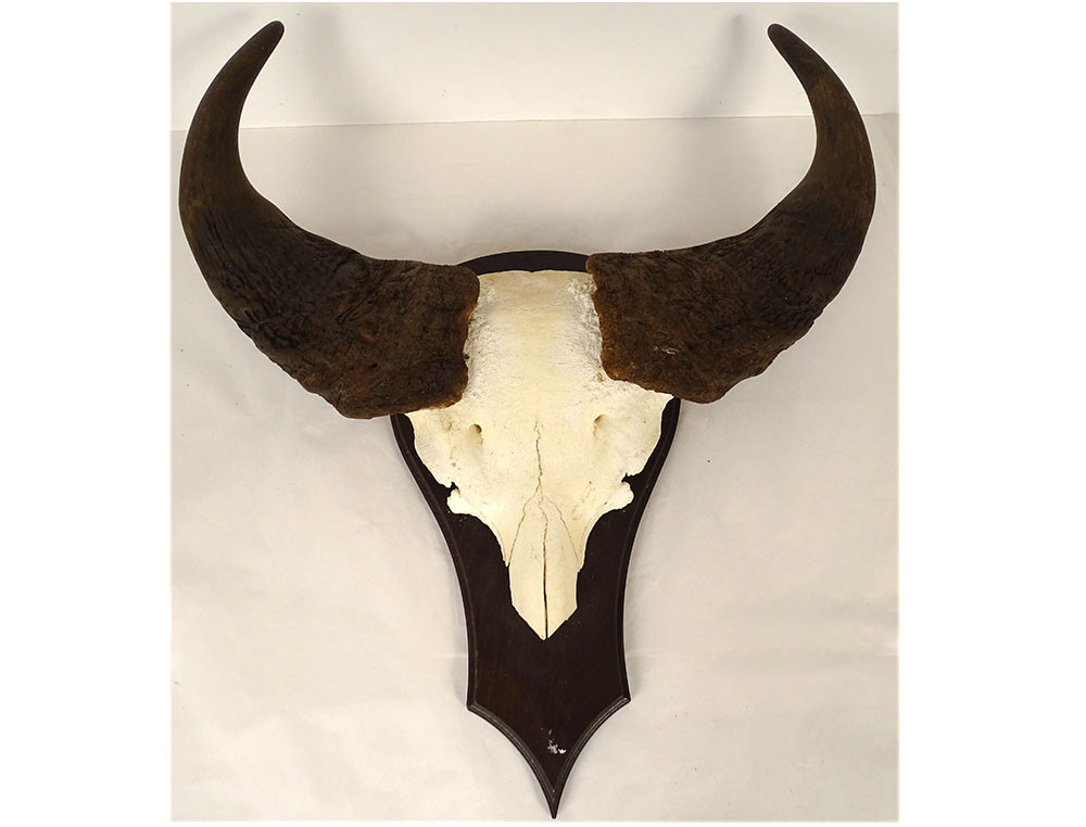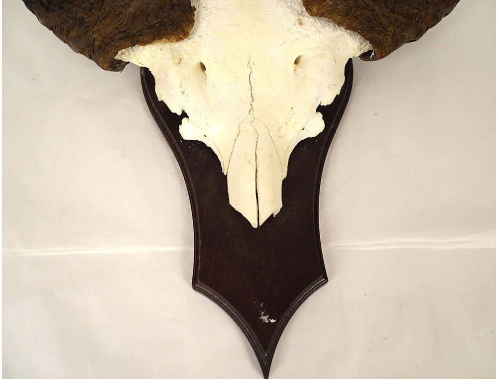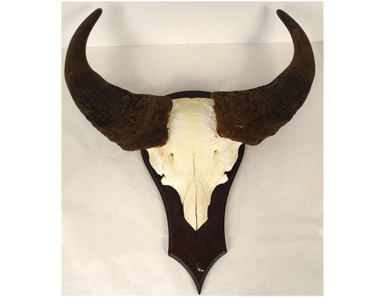 Hunting trophy showing the slaughter of an African buffalo with its horns, on its wooden shield, from Burkina Faso - Ougarou, dated 2006.