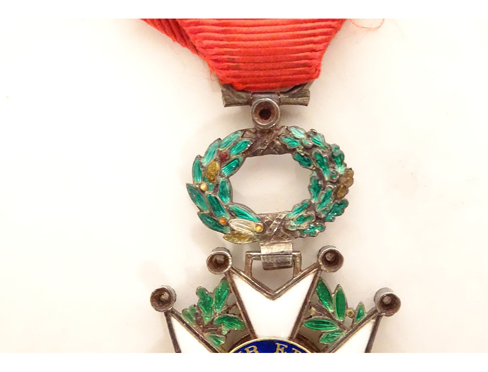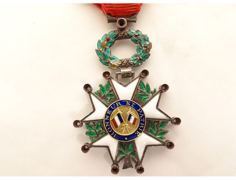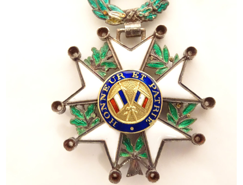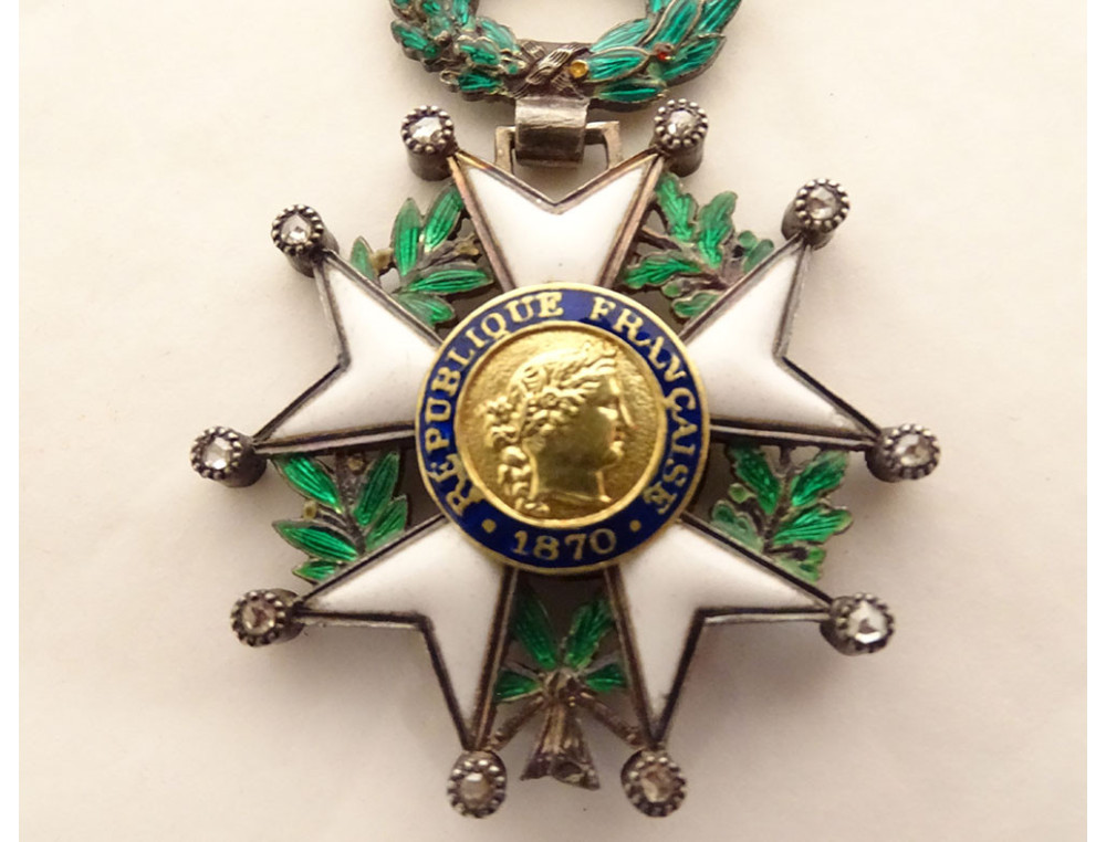 Medal of the Legion of Honour in solid silver (boar's head hallmark), enamel and small brilliants, representing on the obverse the effigy of Ceres laureate with "République Française 1870" and on the reverse the crossed tricolour flag and standard and legend "Honneur et Patrie", on a laurel wreath, with a ribbon, from the Third Republic period, 19th century.
