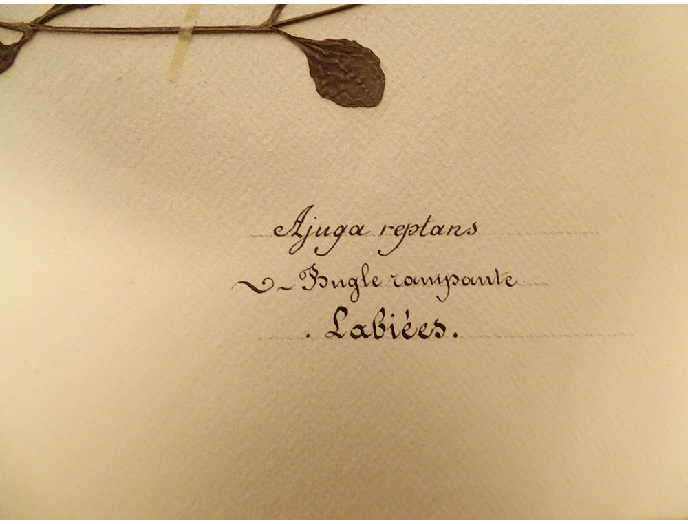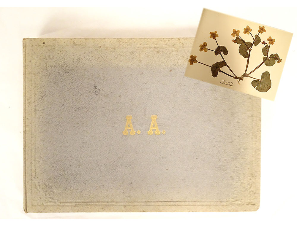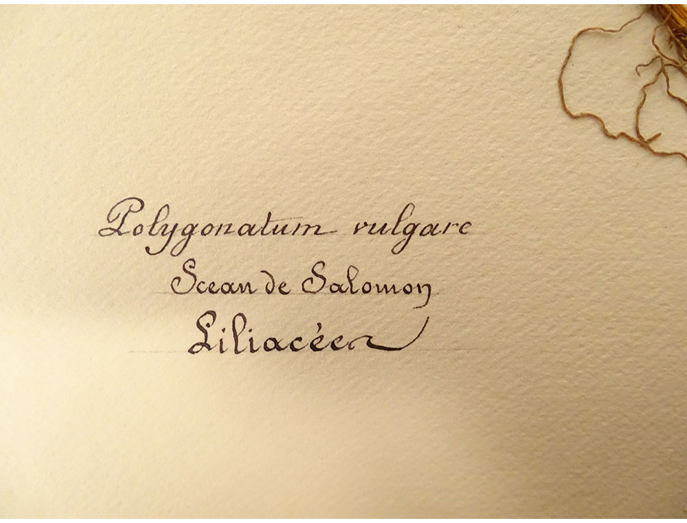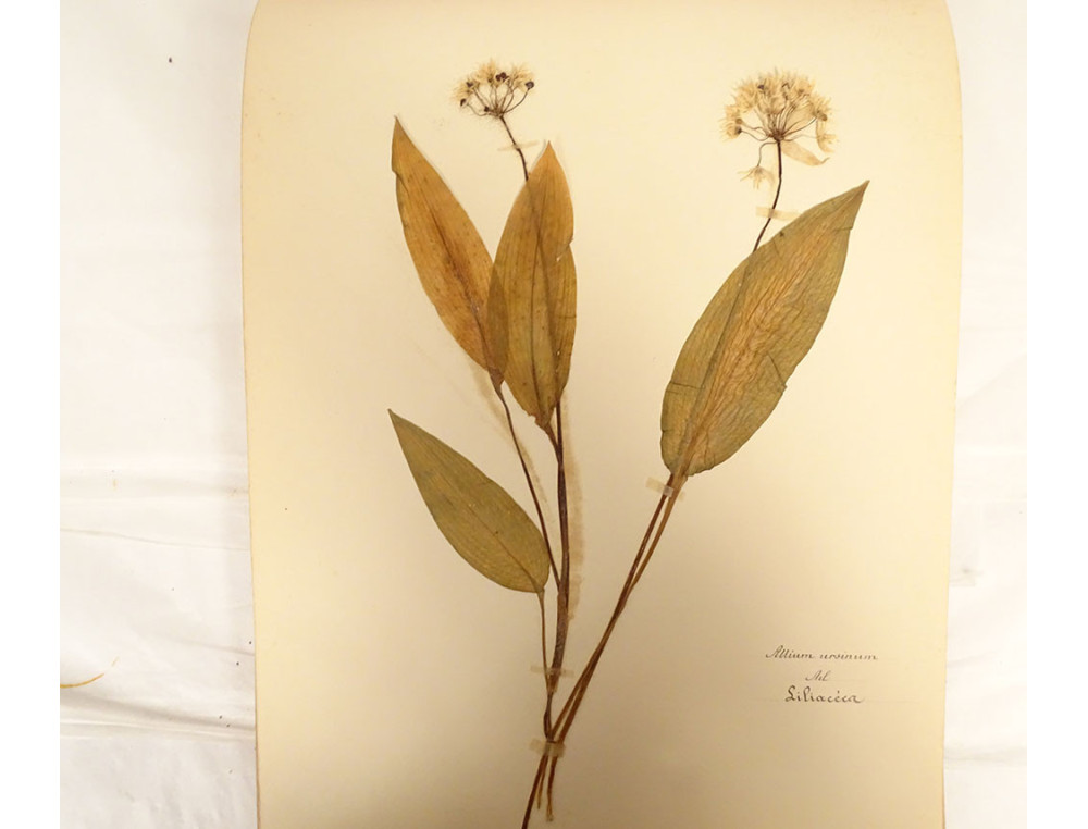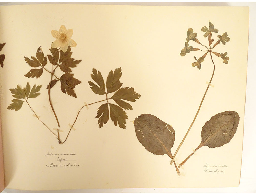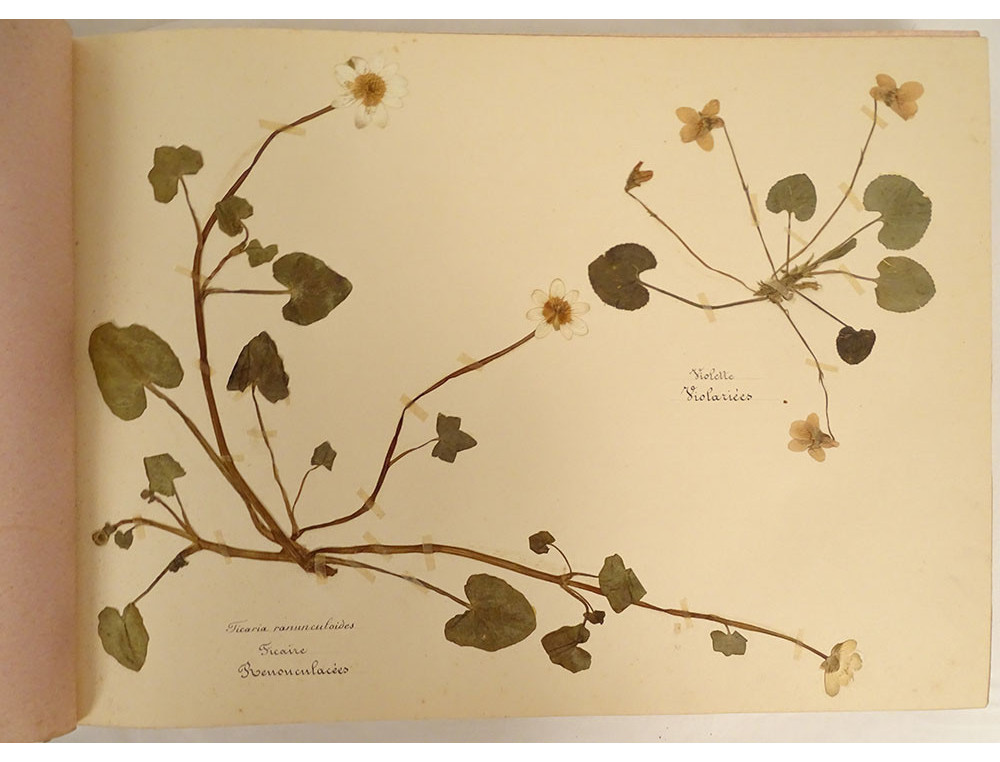 An old herbarium comprising many pages with plants and flowers listed with their names (common and scientific) and family in manuscript (for example: Liliaceae, Ranonlucaceae, Amaryllidae...etc), from the early 20th century.
