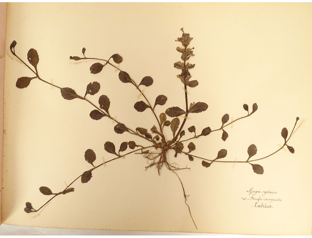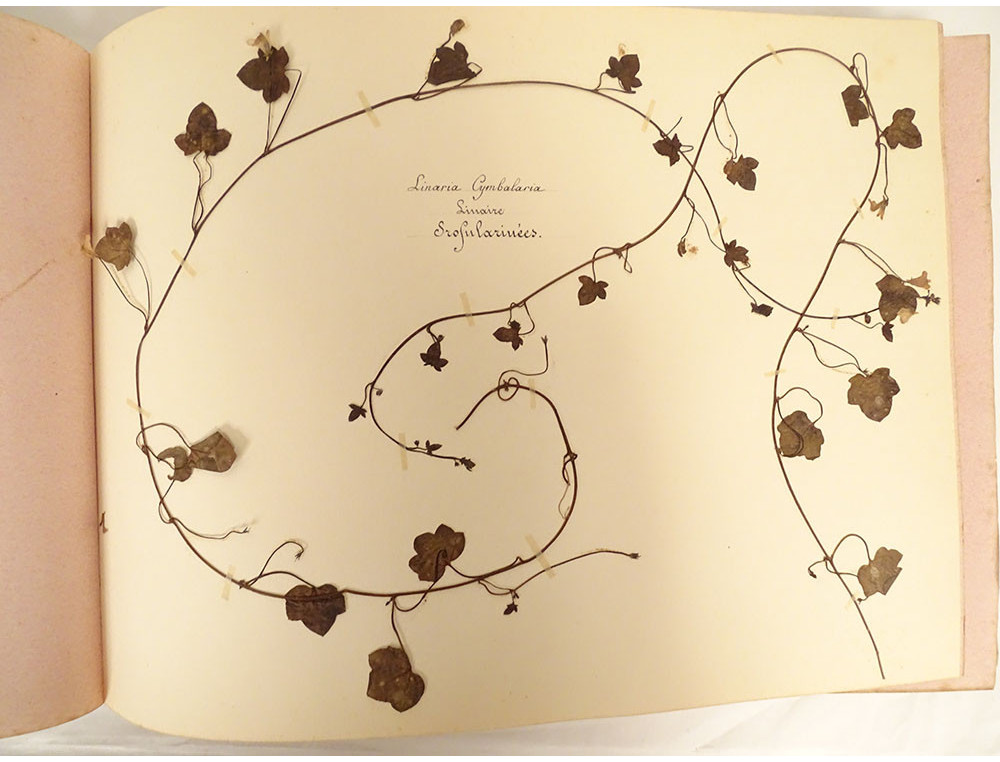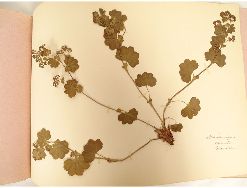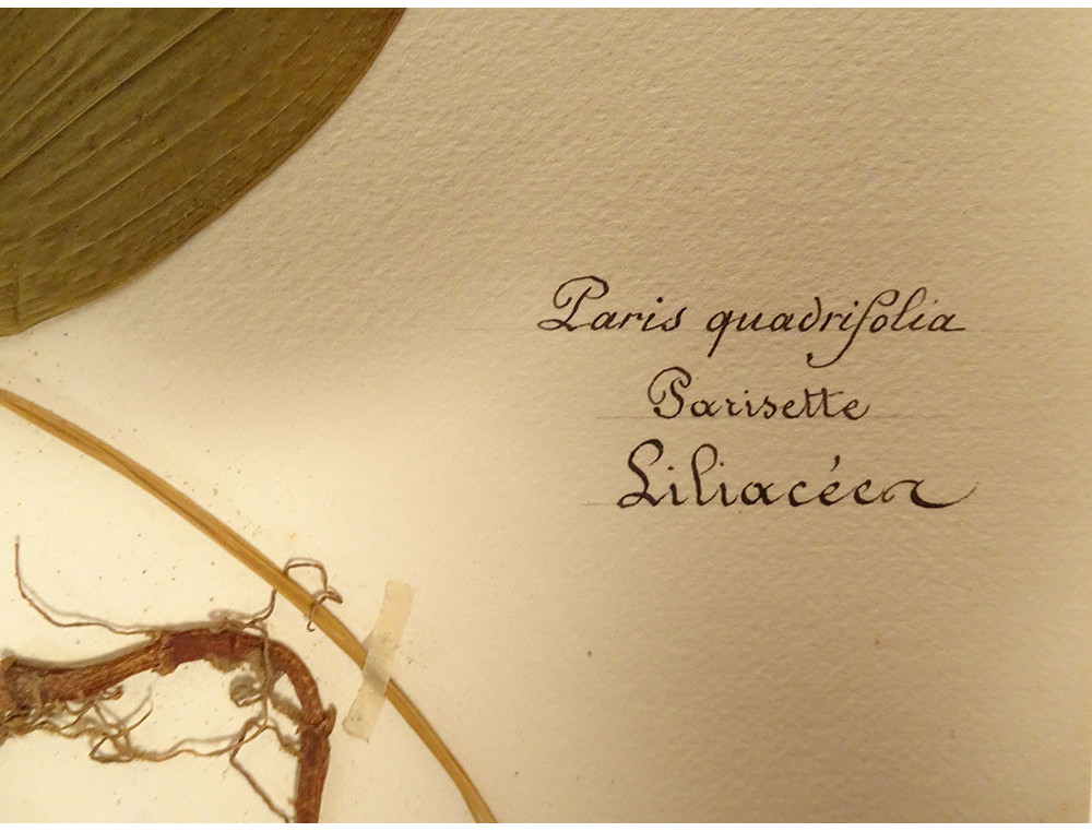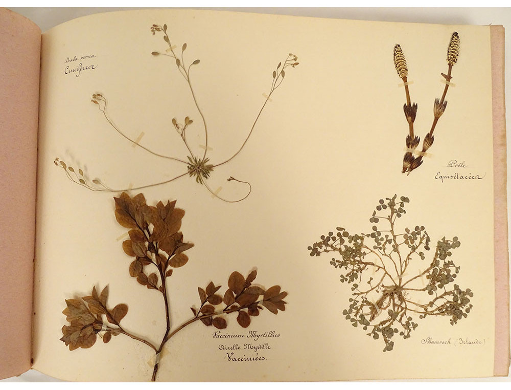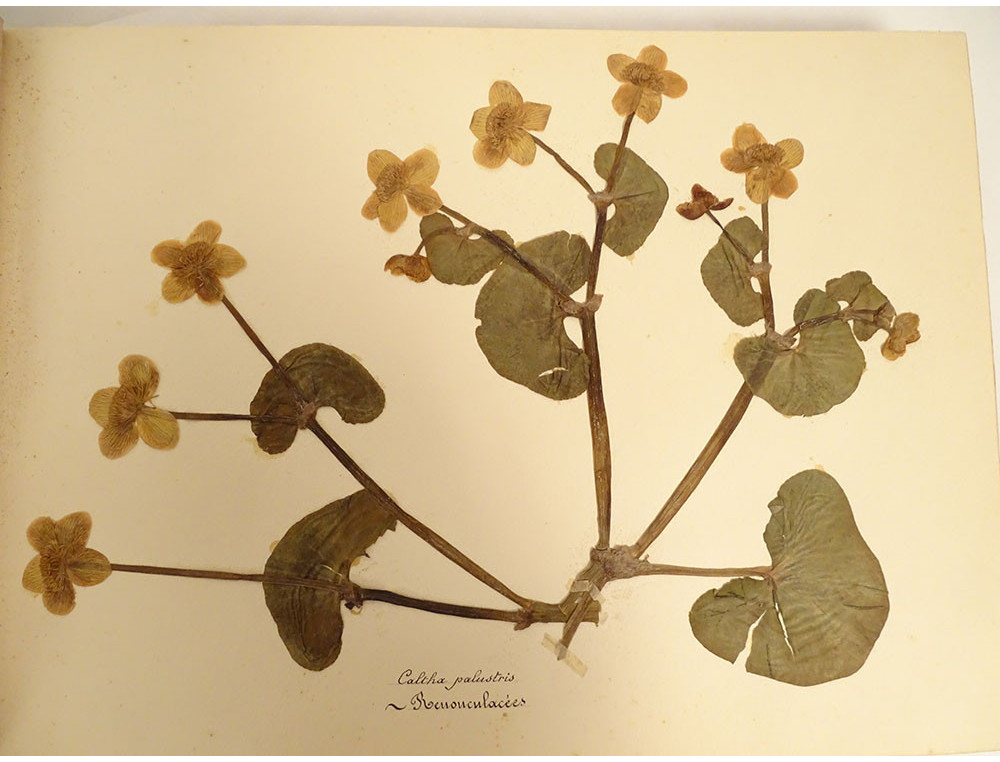 An old herbarium comprising many pages with plants and flowers listed with their names (common and scientific) and family in manuscript (for example: Liliaceae, Ranonlucaceae, Amaryllidae...etc), from the early 20th century.