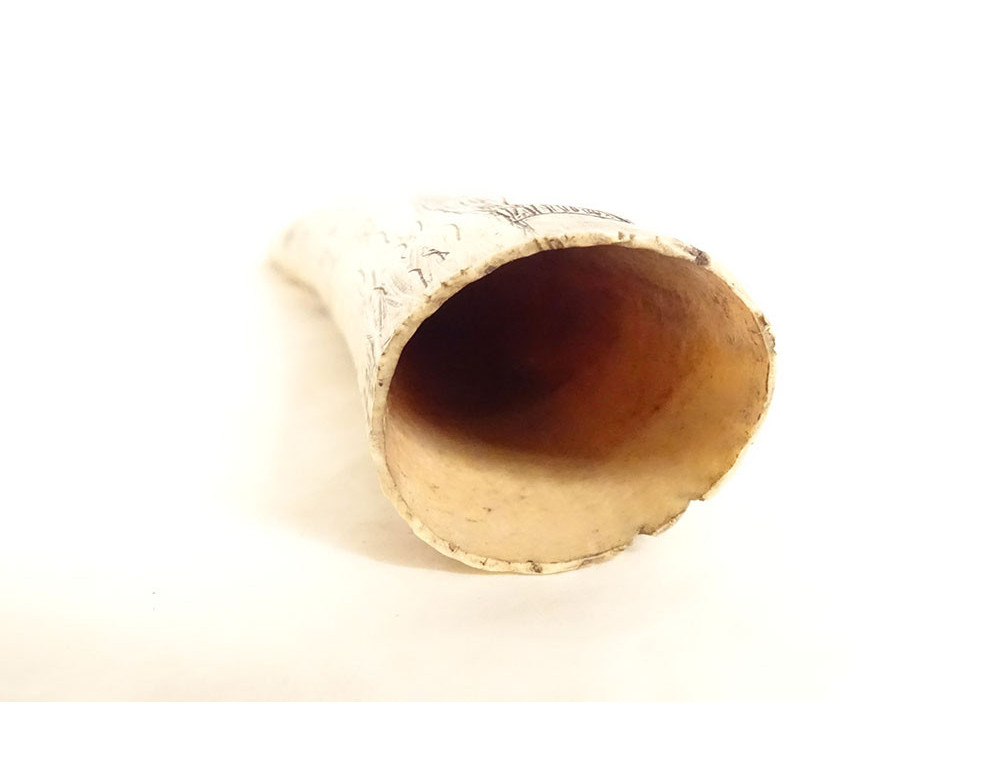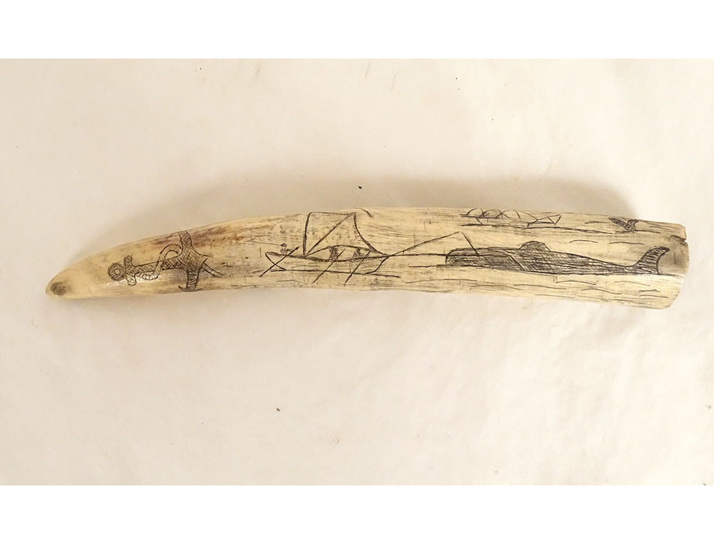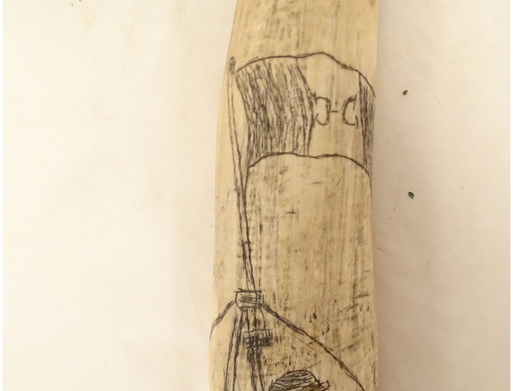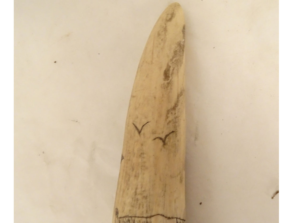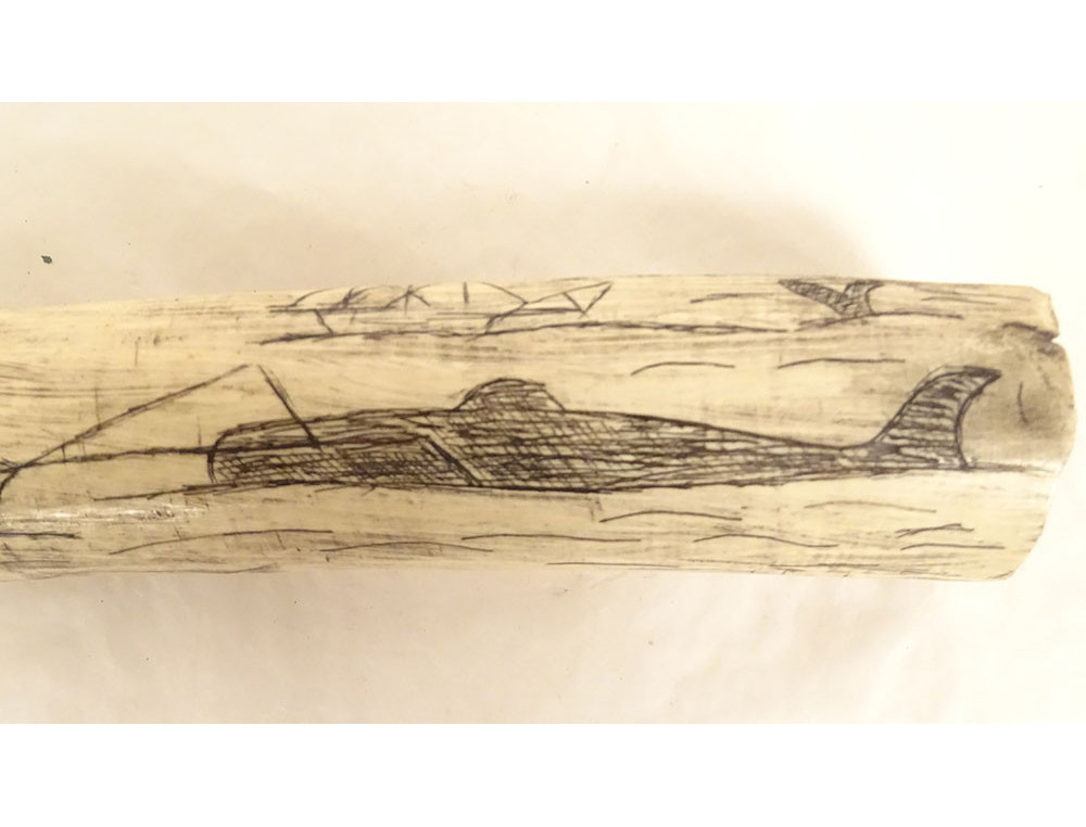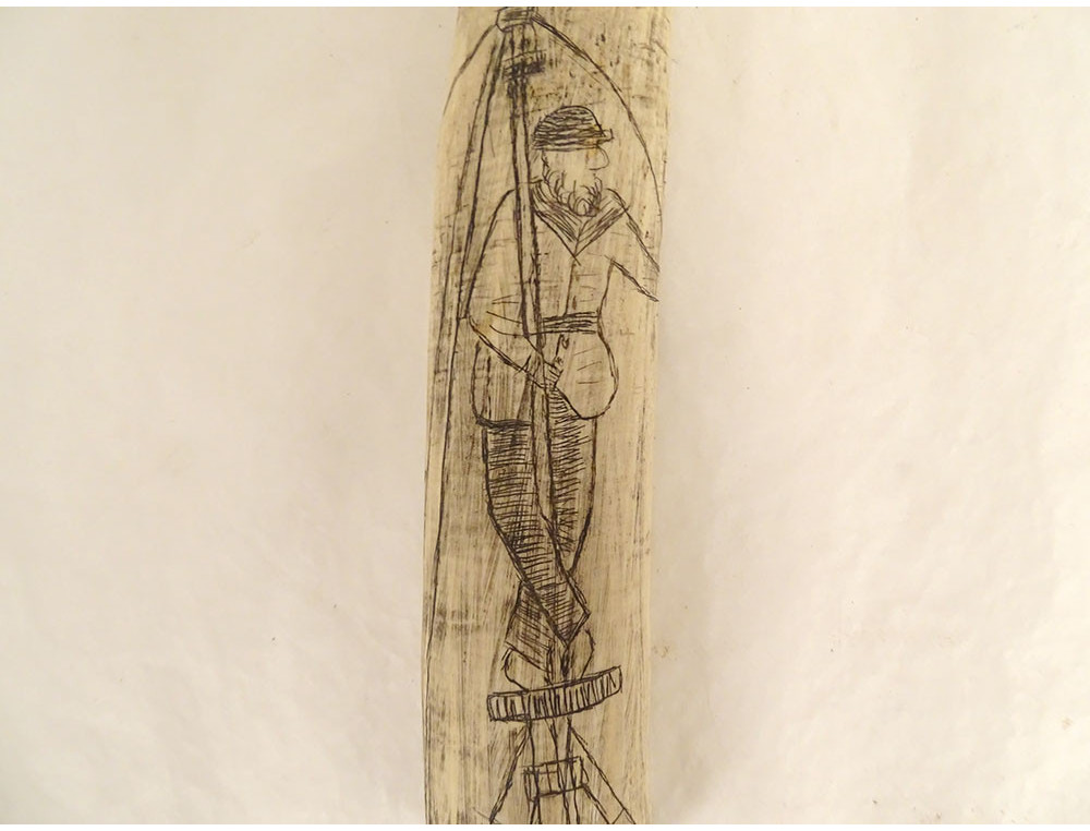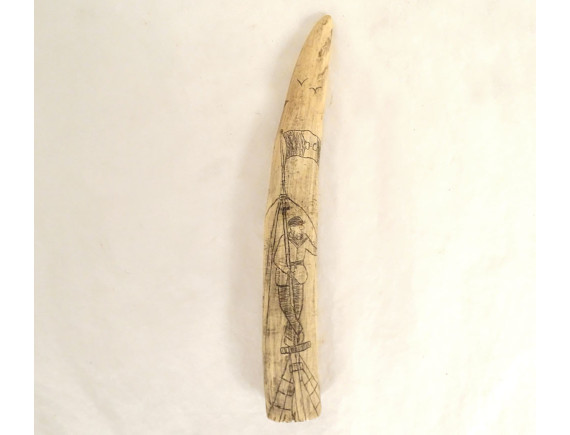 Scrimshaw, walrus tooth, ivory, marine engraving, fishing, sperm whale, anchor, fisherman, 19th century