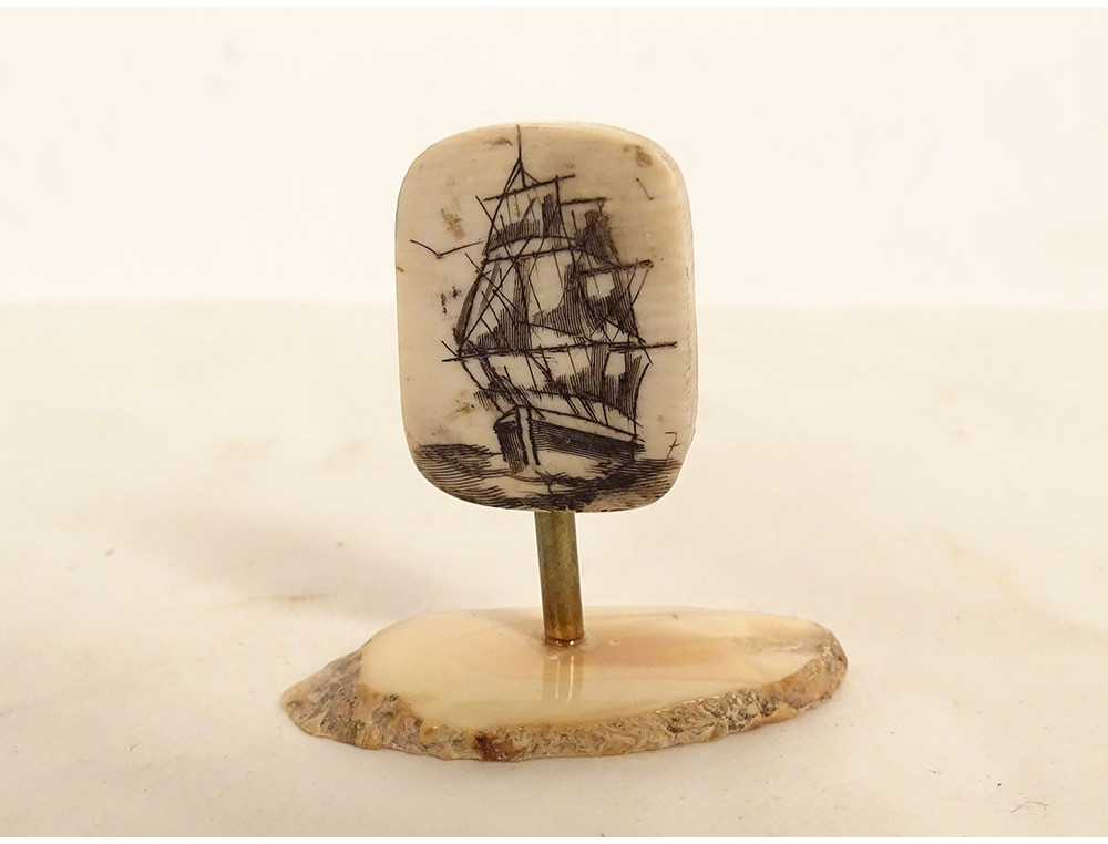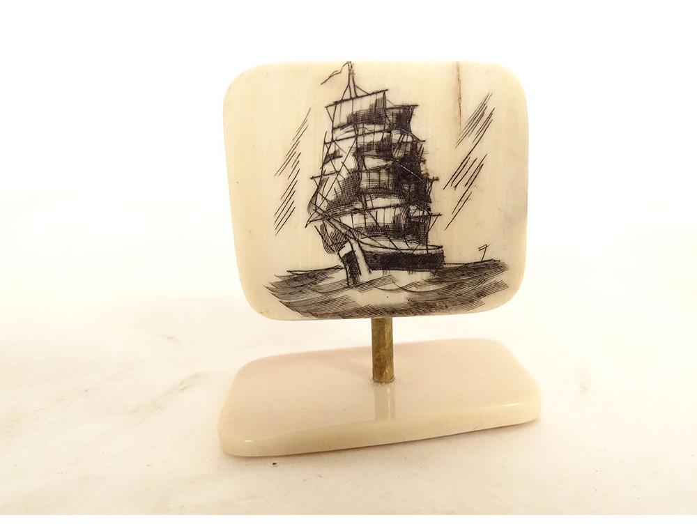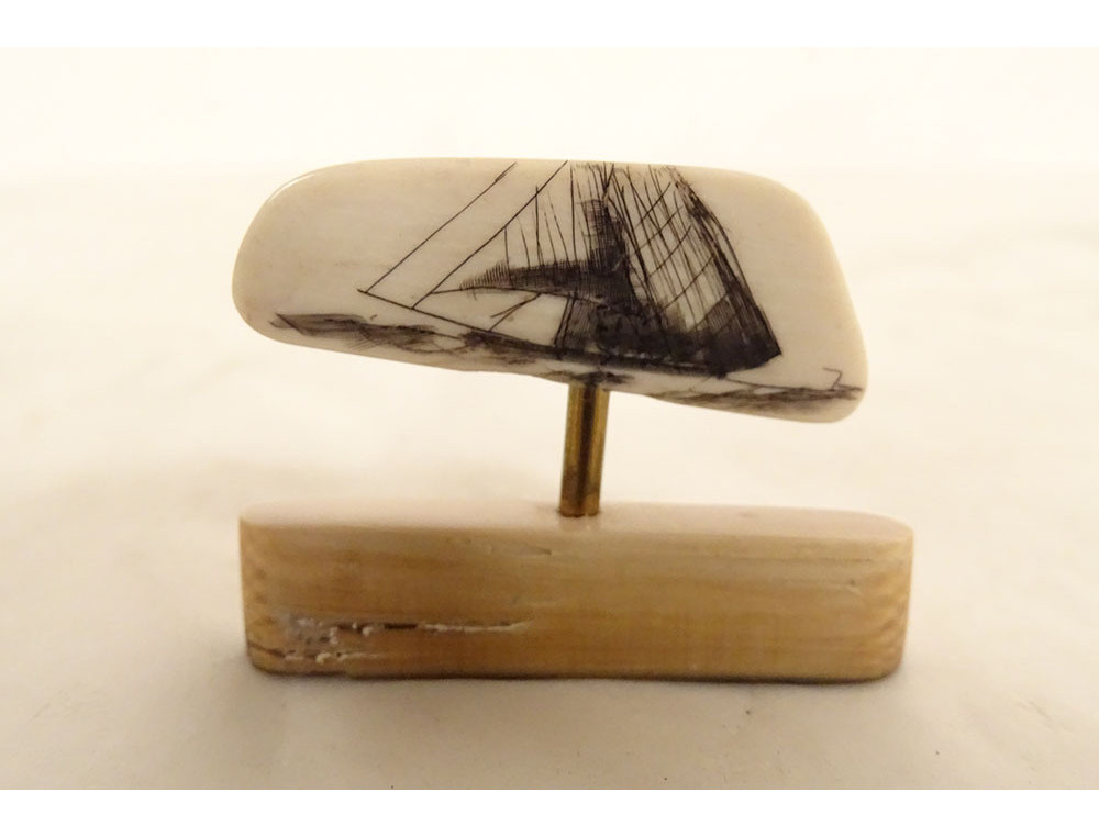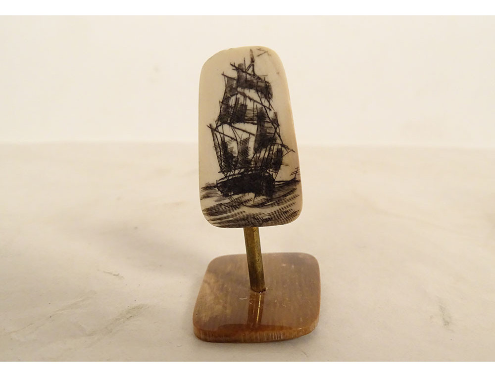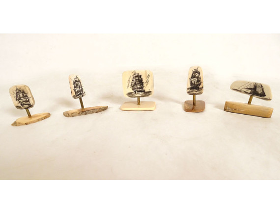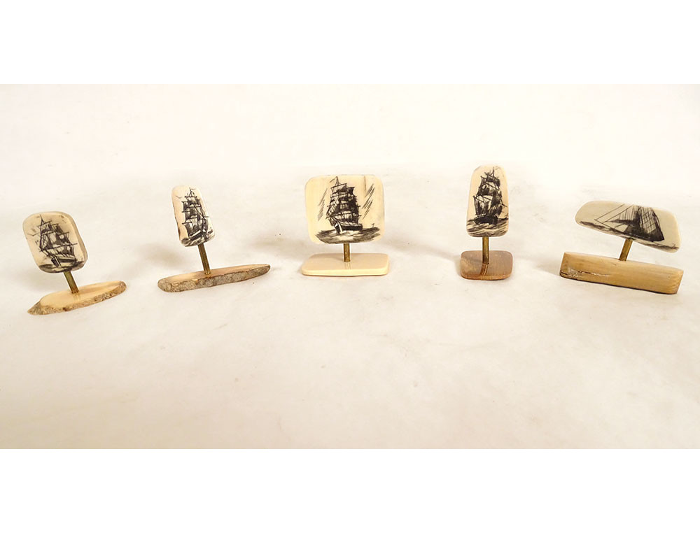 5 small scrimshaw plaques, stag horn, sailboats, boats, ship, 20th century souvenir