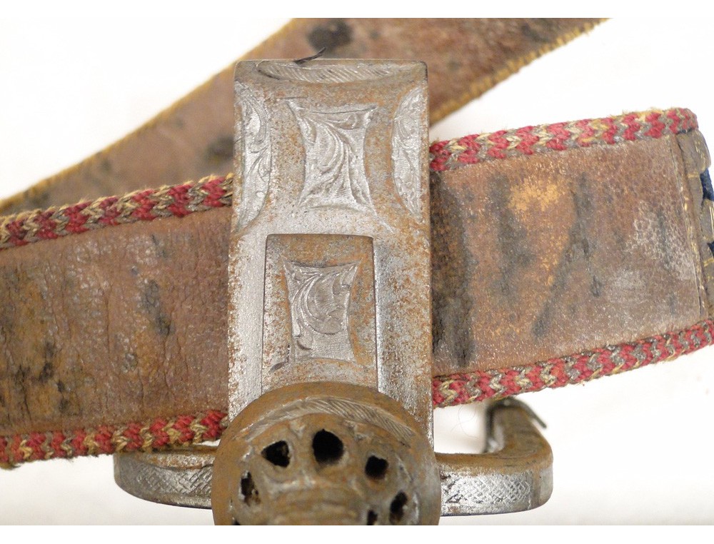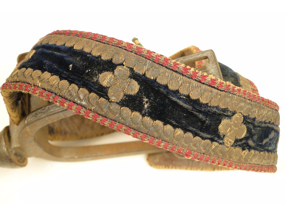 Very nice pair of spurs horse or Ottoman Algerian wrought iron bands finely carved floral and plant location Uparties heel leather embroidered in silver and velpurs son, of XIXth century.