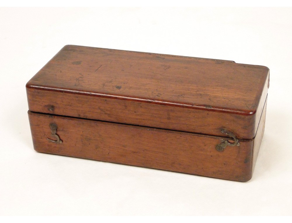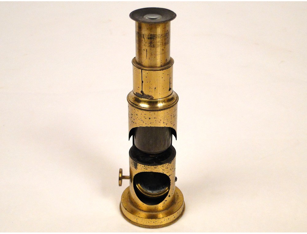 Rare small antique brass microscope golden mahogany cabinet with two objectives replacement of XIXth century.