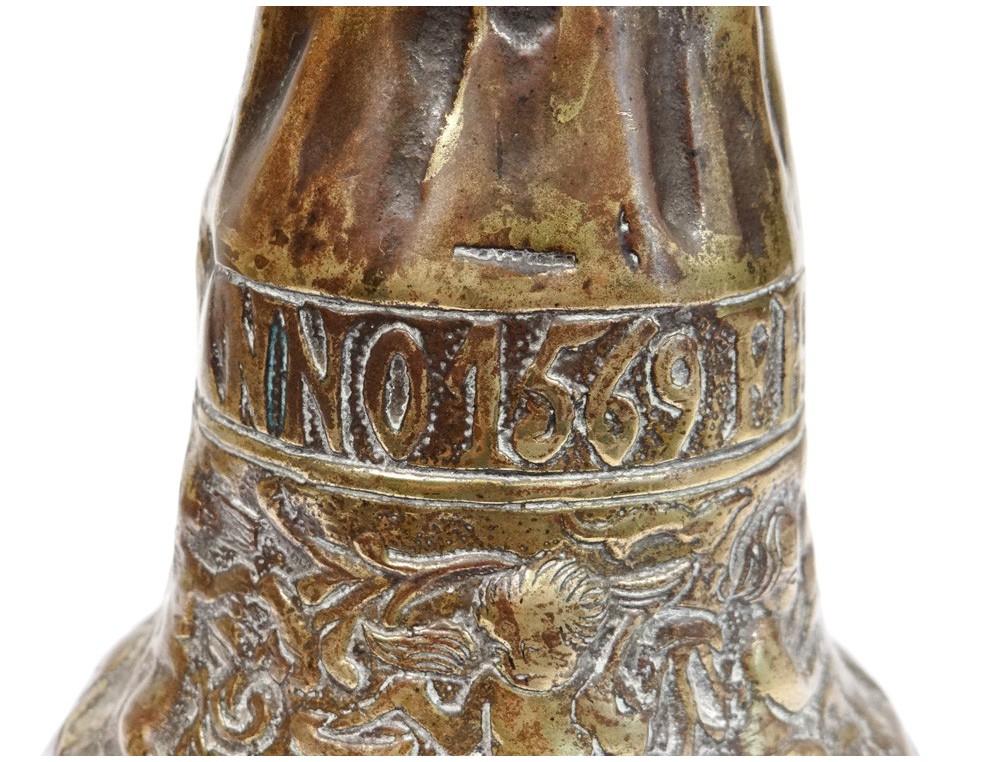 Very nice large bell or bell finely carved gilt bronze, decorated with a woman in the Middle Ages ceremonial dress with veil, as well as several cherubs and putti around, made in the style of the Middle Ages, of 'XIXth century.