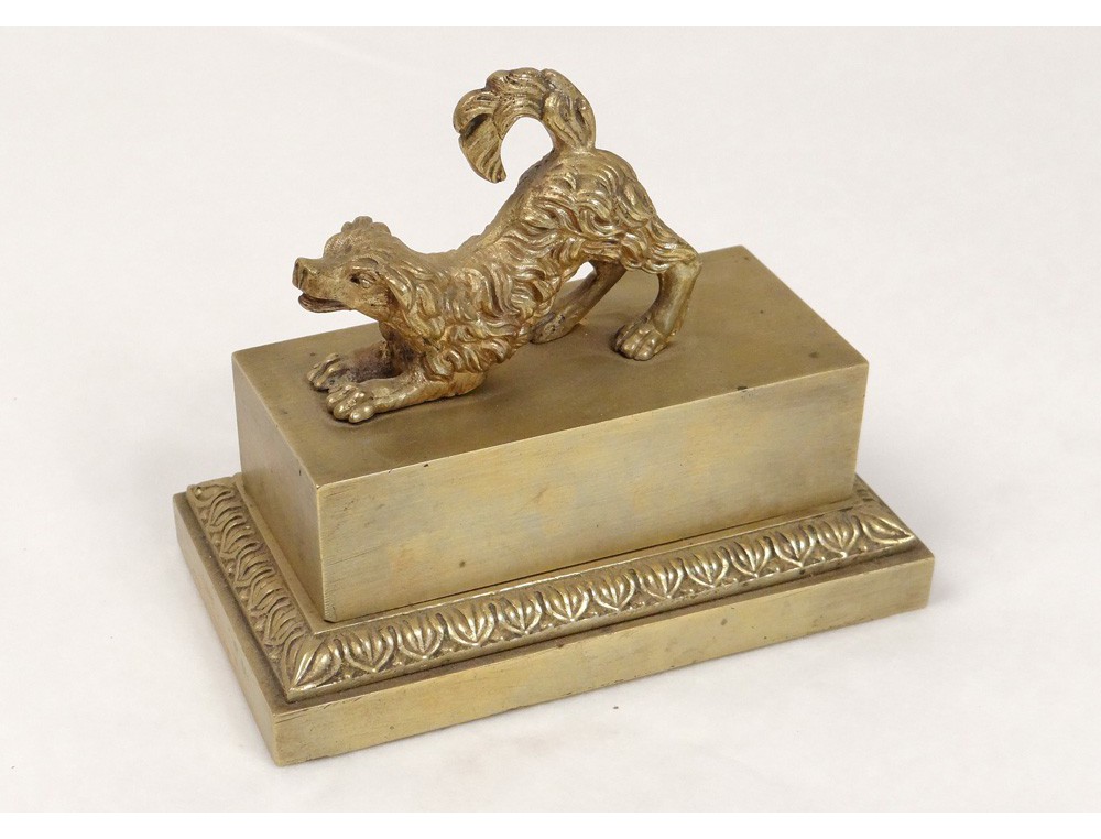 Beautiful gilded bronze inkwell finely chopped, decorated with a dog playing on top, and a plant on the edge frieze, antique restoration nineteenth century.