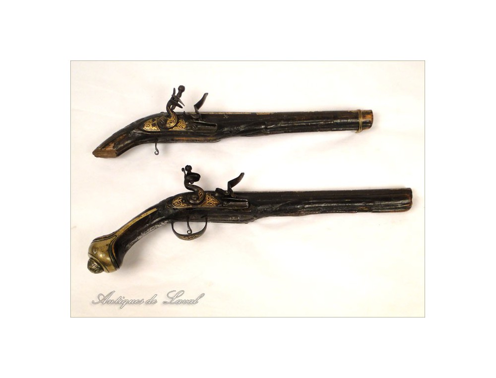 Pair of dueling pistols or officer, finely decorated with gilding, antique eighteenth century.