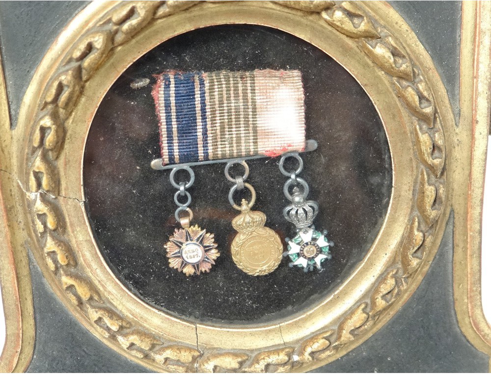 Superne and rare wooden frame blackened and gilded, decorated with garlands and plant a shell at the top, with three small medals: a Legion of Honor, a medal of St. Helena and * (certainly) Medal the Order of Pius IX ** (dated 1847), XIXth century.