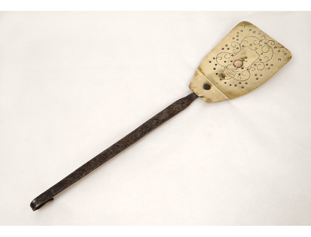 Very nice scoop finely perforated copper kitchen, decorated with a central shield, sleeve wrought iron antique eighteenth century.
