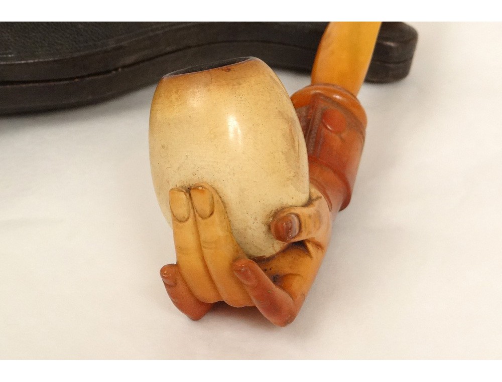 Superb pipe meerschaum and amber decorated with a hand holding a sort of egg in his hand in the original case, XIXth century.