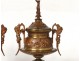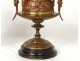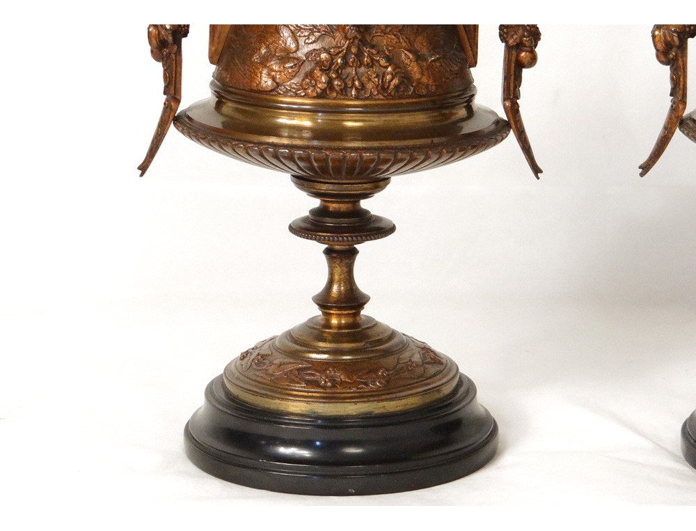 Pair of bronze censers (two patina) finely chopped, decorated with dogs sitting on the covers, and bird flying around fruit garlands, decors of animal sculptor E. Cana *, round base in black marble, XIXth century.