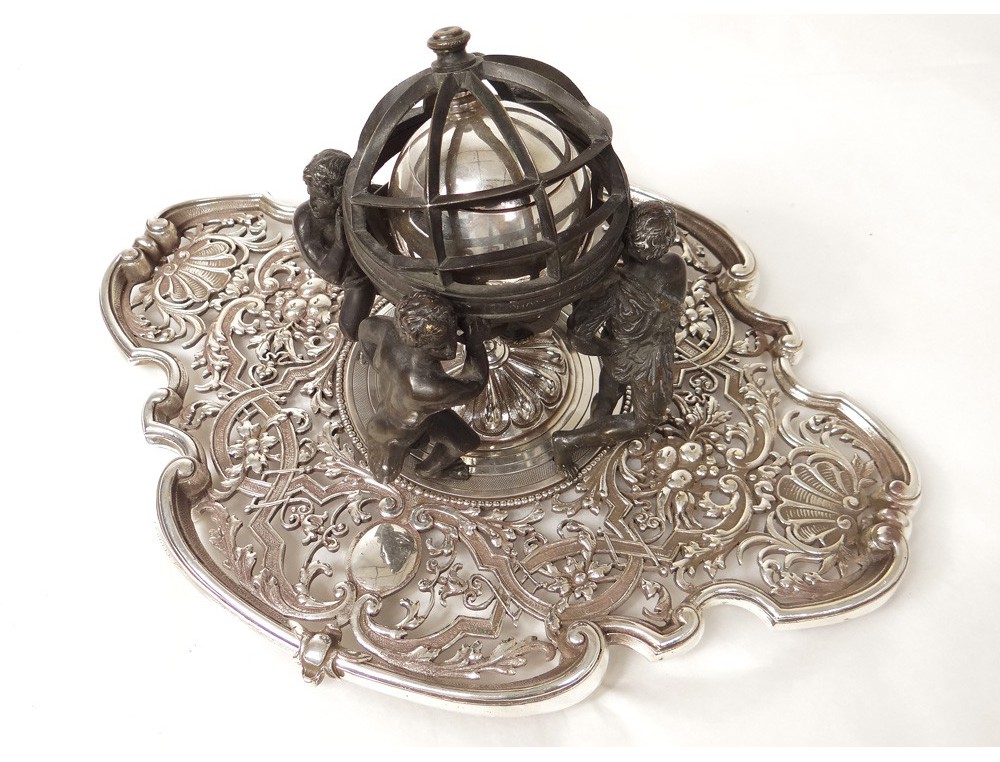 Inkwell bronze (silver and brown patina) representing four characters, symbols of the four continents, supporting on their shoulders an armillary sphere, a finely carved shelf and perforated shells decor stylized and scrolls and floral arabesques and fruit clusters, signed bronzier Lerolle Brothers *, of XIXth century.