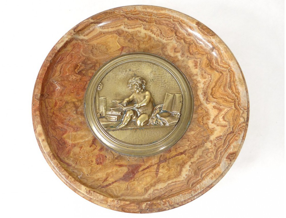 Decorative cup marble and gilded bronze finely chiseled in central decoration of a cherub sitting among books and articles, foot decorated with friezes and vegetable pearls, Napoleon III nineteenth century.