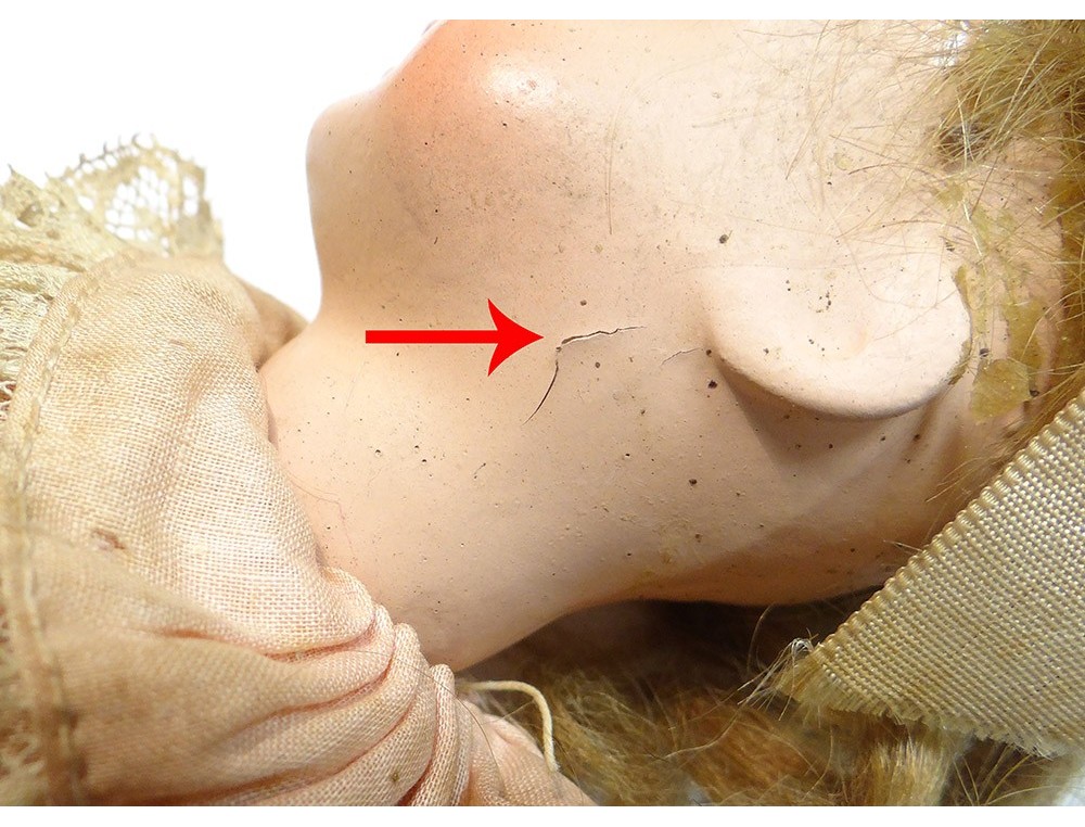 A note: some stains and dirt, lack of hair on the wig that is slightly off, the clothes are a bit yellowed and bitten, well look at photos.