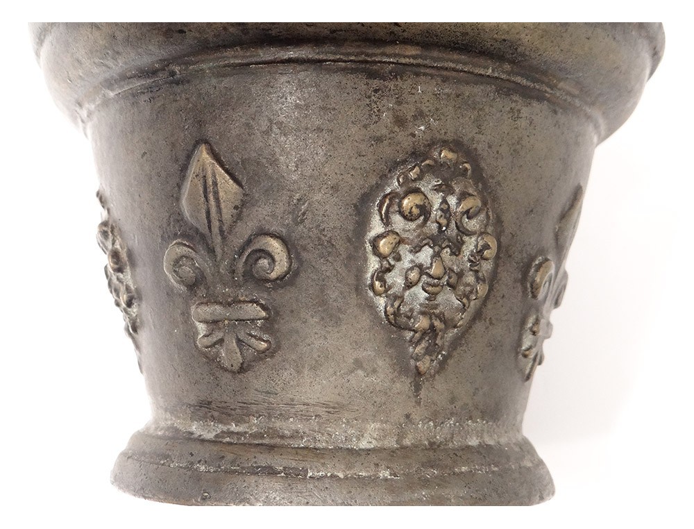 Mortar of apothecary in brass *, decorated with flowers of lilies and masks of faunas, work certainly from the Puy-en-Velais, period XVIIth century.