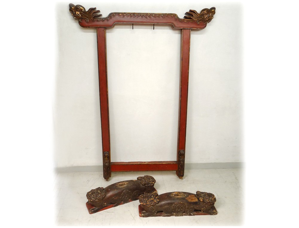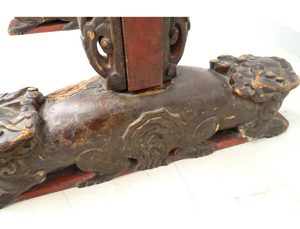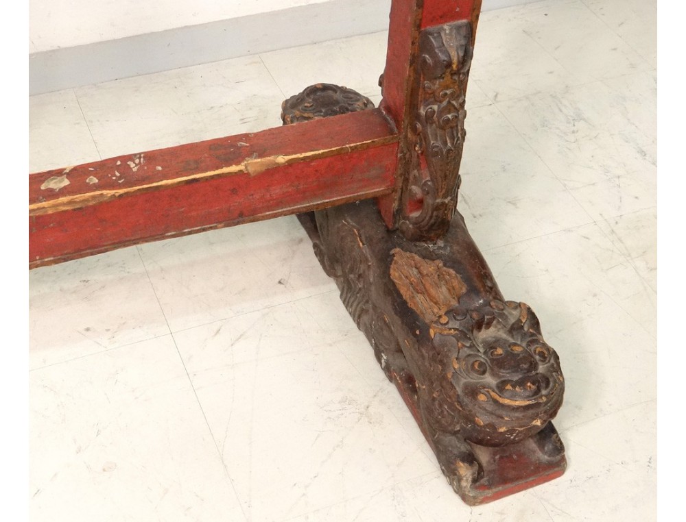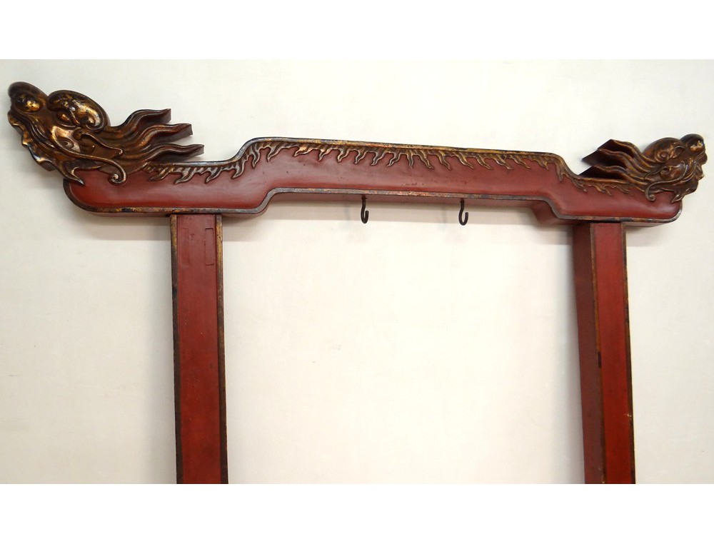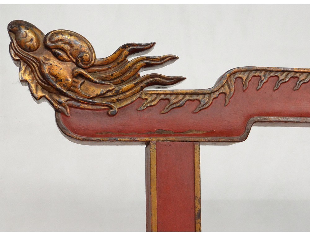 Gong Chinese Temple, carved gilt and polychrome decorated with two dragon heads at the top, shaped legs of fantastic animals, hinge copper, antique eighteenth century.