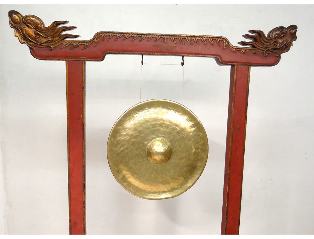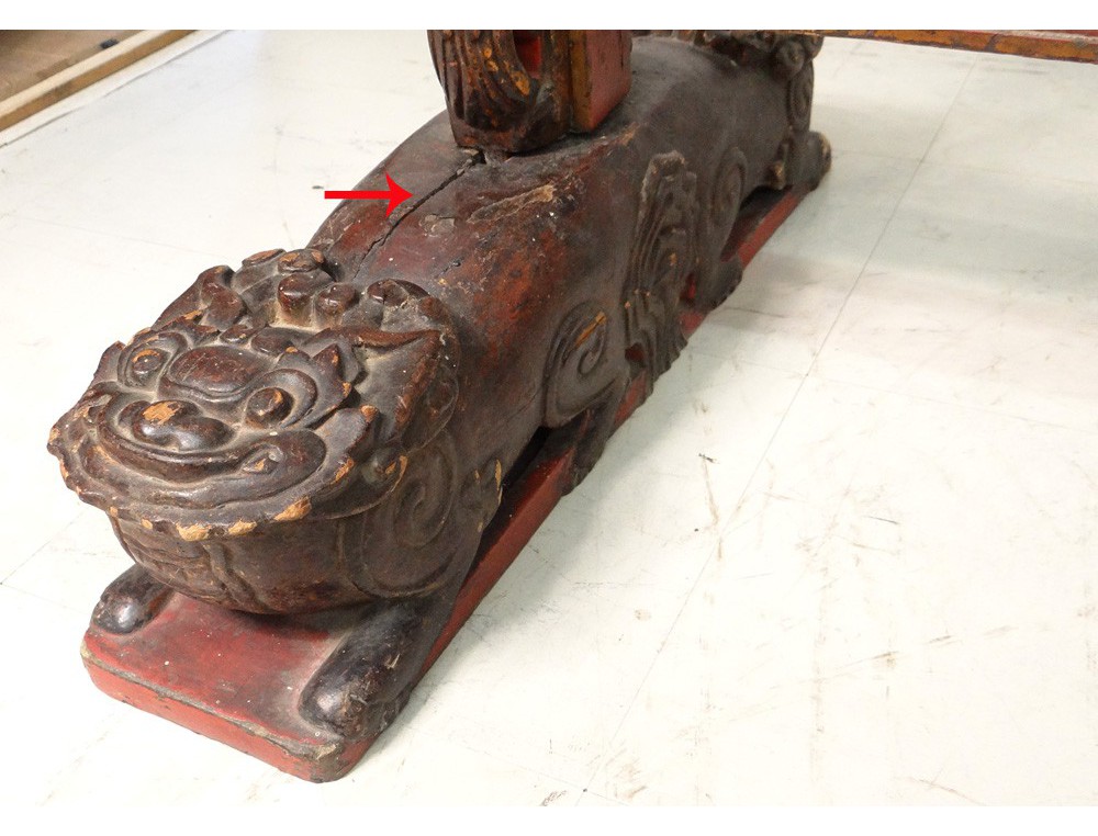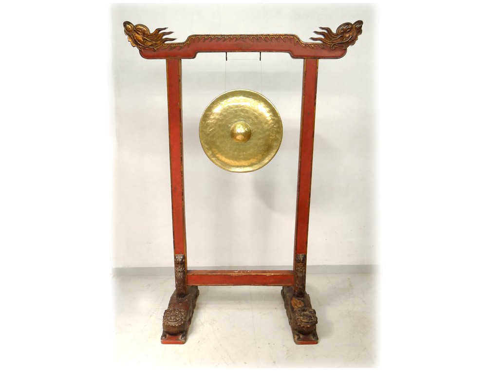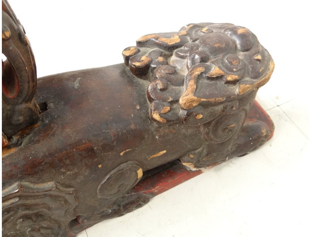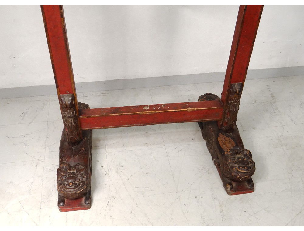 Gong Chinese Temple, carved gilt and polychrome decorated with two dragon heads at the top, shaped legs of fantastic animals, hinge copper, antique eighteenth century.