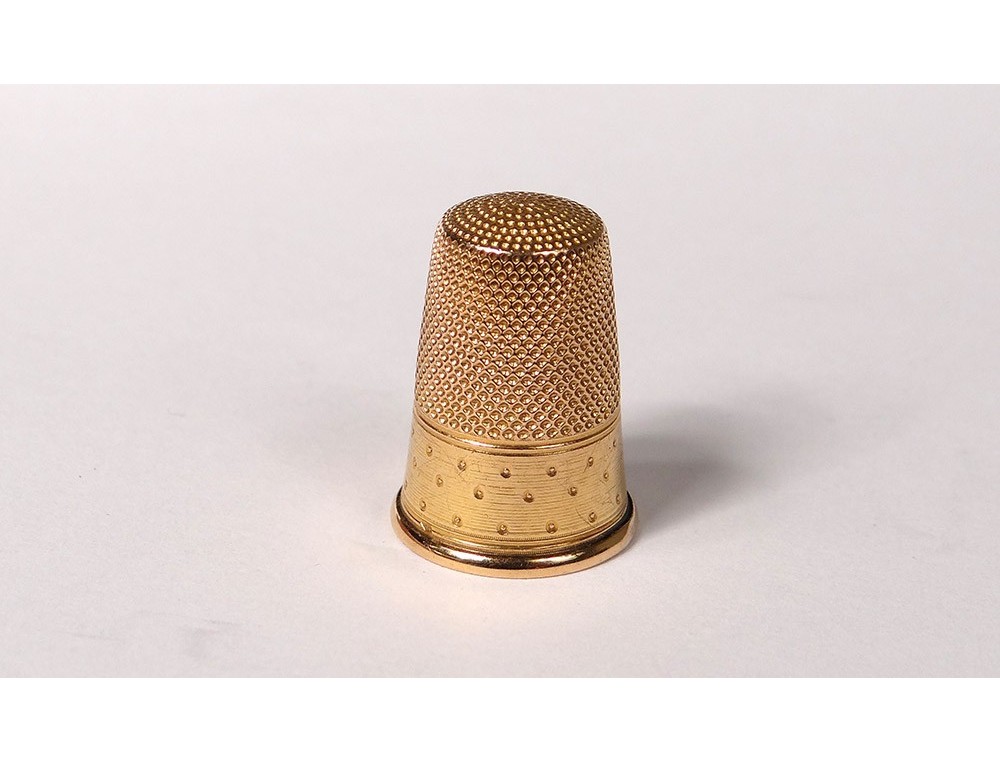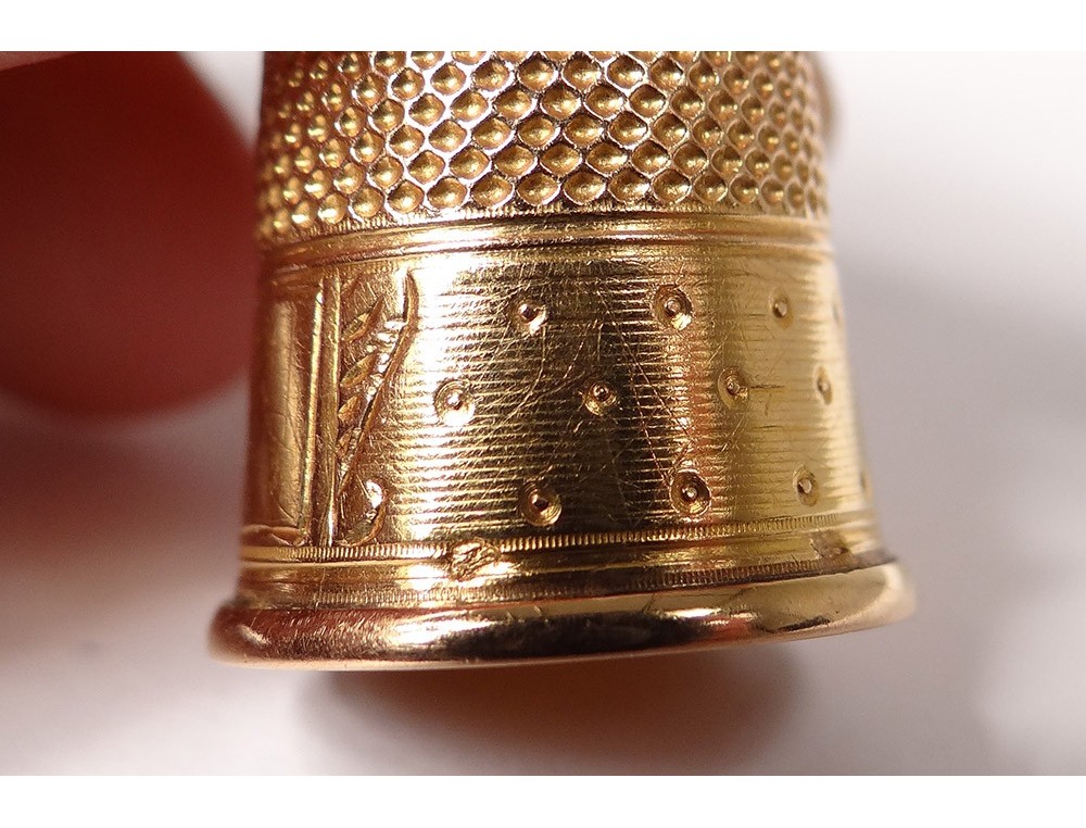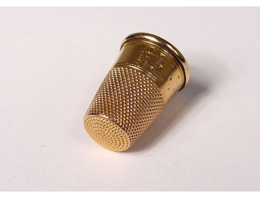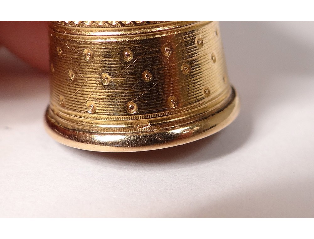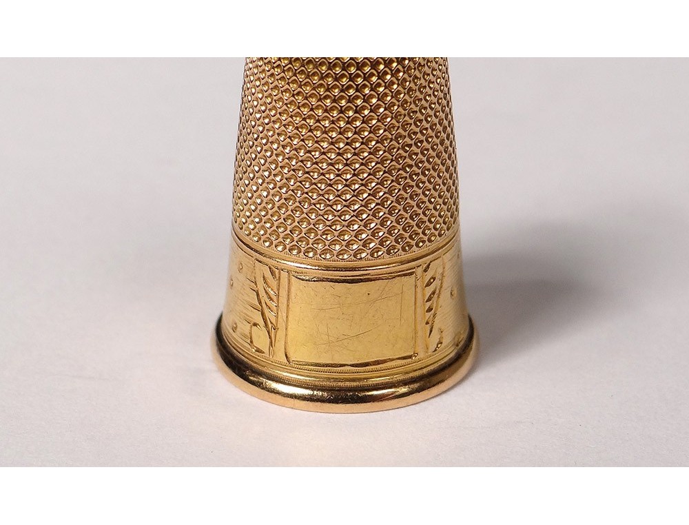 Thimble in 18 kt solid gold finely chiseled, stylized decoration on the perimeter, hallmarked eagle head and goldsmith (illegible), XIXth century.
