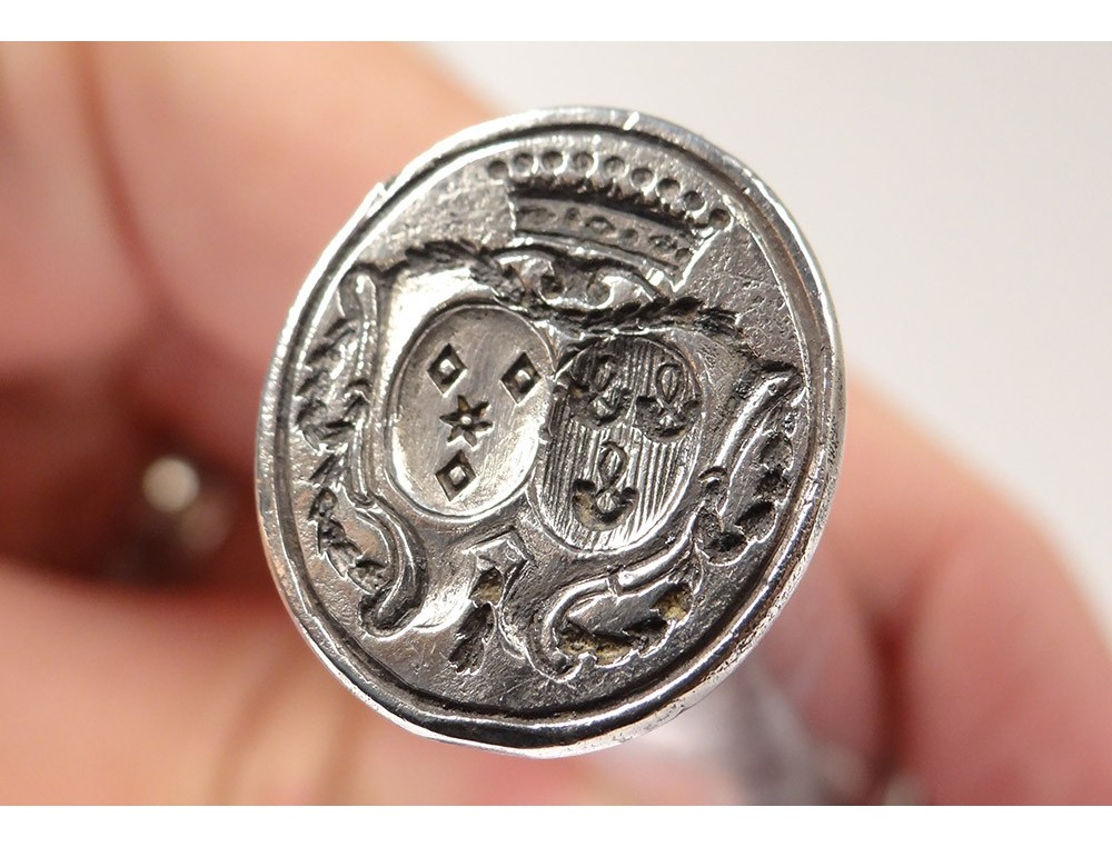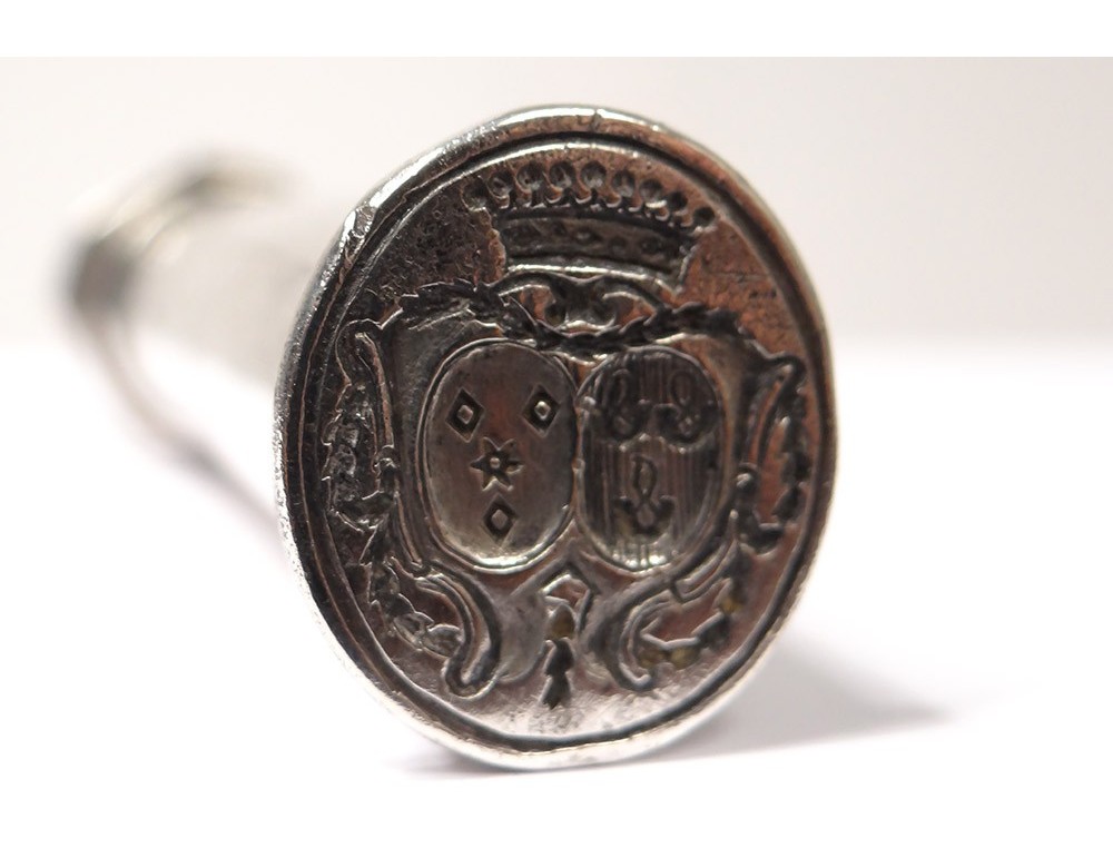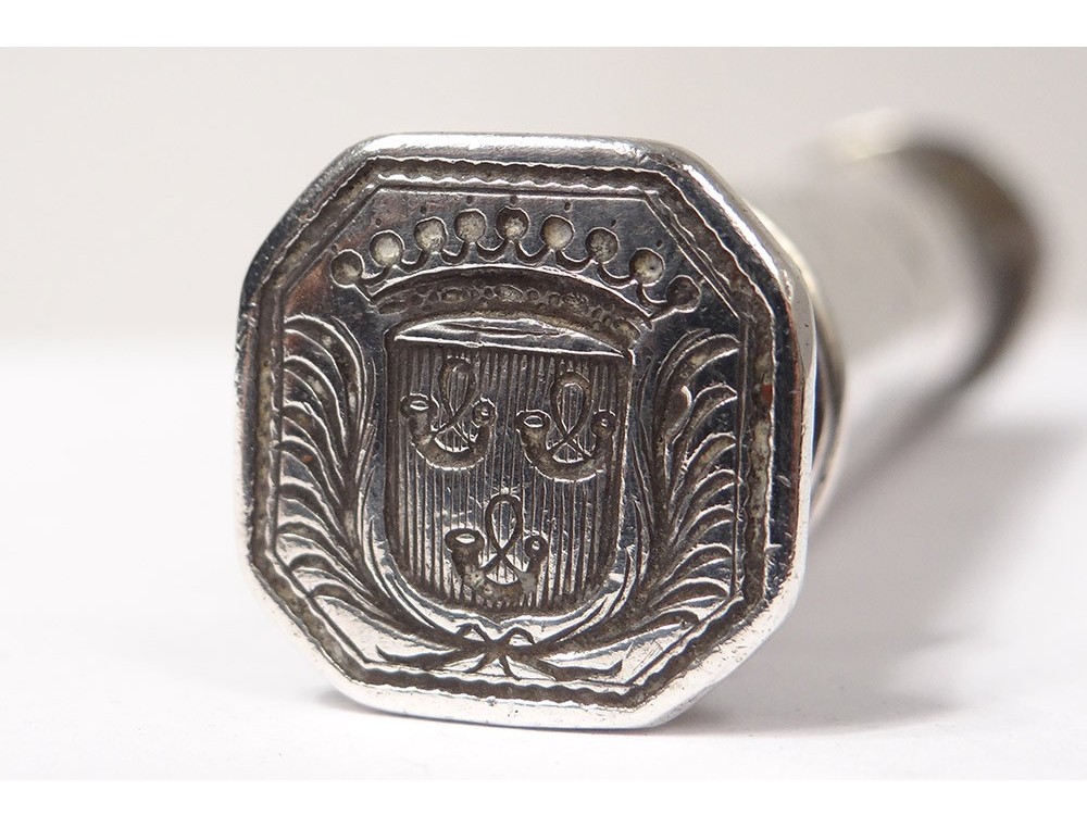 Case in wax * in solid silver carved with a blaosn with three huchets (or hunting horns) wearing a comtale crown on one end; as well as a crest of alliance also wearing a crown of the other, eighteenth century.