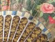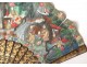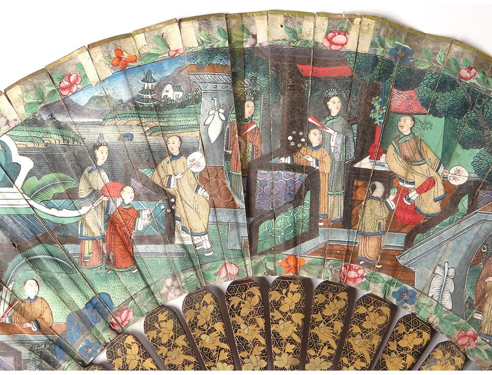 Fan decorated with gouaches representing on one side many Chinese characters (mandarins, women and children) in pagoda landscapes, faces in bone (beef) veneer, on the other side beautiful bouquets of colorful flowers, mount lacquered wood enhanced with gilding decorated with small birds and plants, XIXth century.