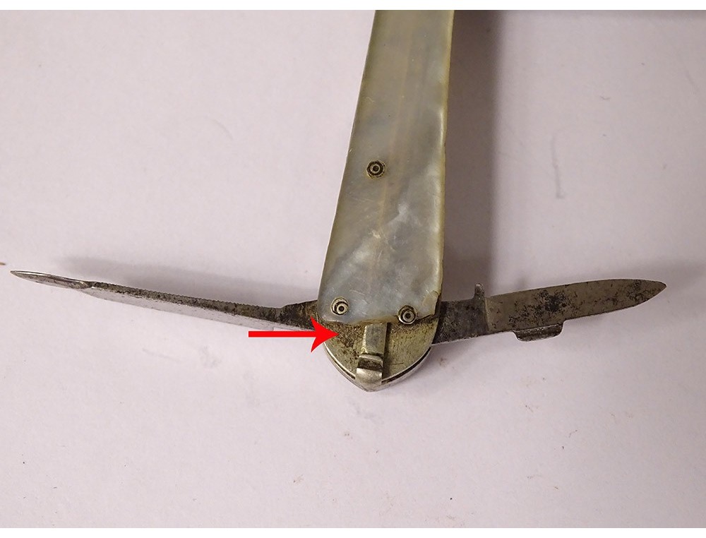 A note: trace of oxidation on the blades, small accidents and gaps on the mother-of-pearl handle (on both sides), wear of time, see photos.