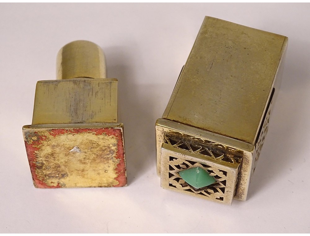 Small table lamp (Berger lamp type) diffuser, in gilded metal finely perforated at the top, top adorned with a small green stone, from the 20th century Art Deco period.