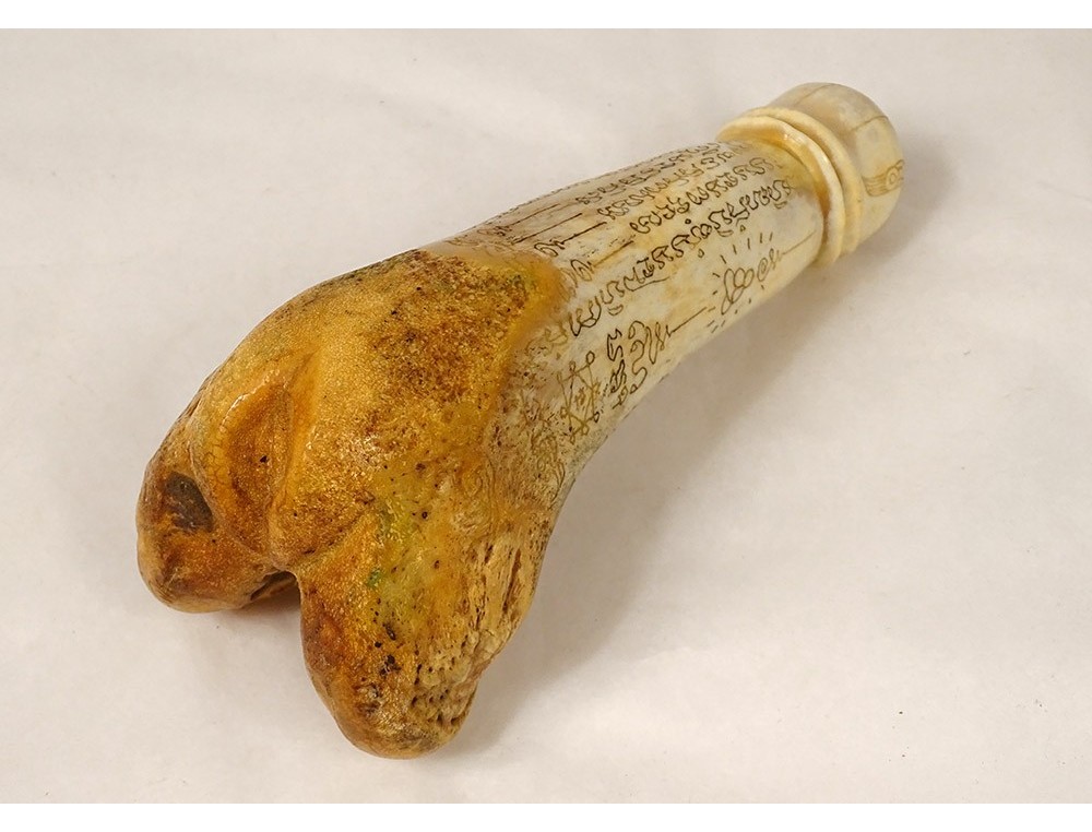 Sculpture or dildo in carved bone, representing a phallus with inscriptions in Sanskrit, from India, XIXth century.