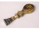 Collector's item, the oldest examples of which date from four millennia before our era. The stamp was first used to affix the personal mark of a character to guarantee the contents of a box or an envelope, the authenticity of a document. The term seal was also used. The small personal stamp has in fact been used in Europe since the Middle Ages. It can be a ring mounted with a hard stone intaglio, or a gold bezel engraved in hollow (the signet rings are nothing else!). But more numerous are the handles fitted, formed of a hard stone engraved in intaglio: carnelian, garnet, sapphire, rock crystal, agate; some are even ancient intaglios. These small stamps are sometimes jewels that one hangs from a chain or from the chatelaine; like boxes, it is often a gift item. These seals vary in size: we find tiny ones set on pretty chiseled gold mounts, others 1.5 to 2cm in diameter mounted on a handle of gold, pomponne, chiseled silver, mother-of-pearl, hard stone, wood ...