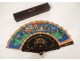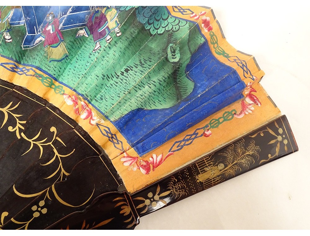Fan decorated with gouaches representing on both sides many Chinese characters (mandarins and women) in interiors and gardens, faces in bone (beef) veneer, lacquered wood frame enhanced with gilding decorated with characters and foliage motifs, in its lacquered box, from the 19th century.