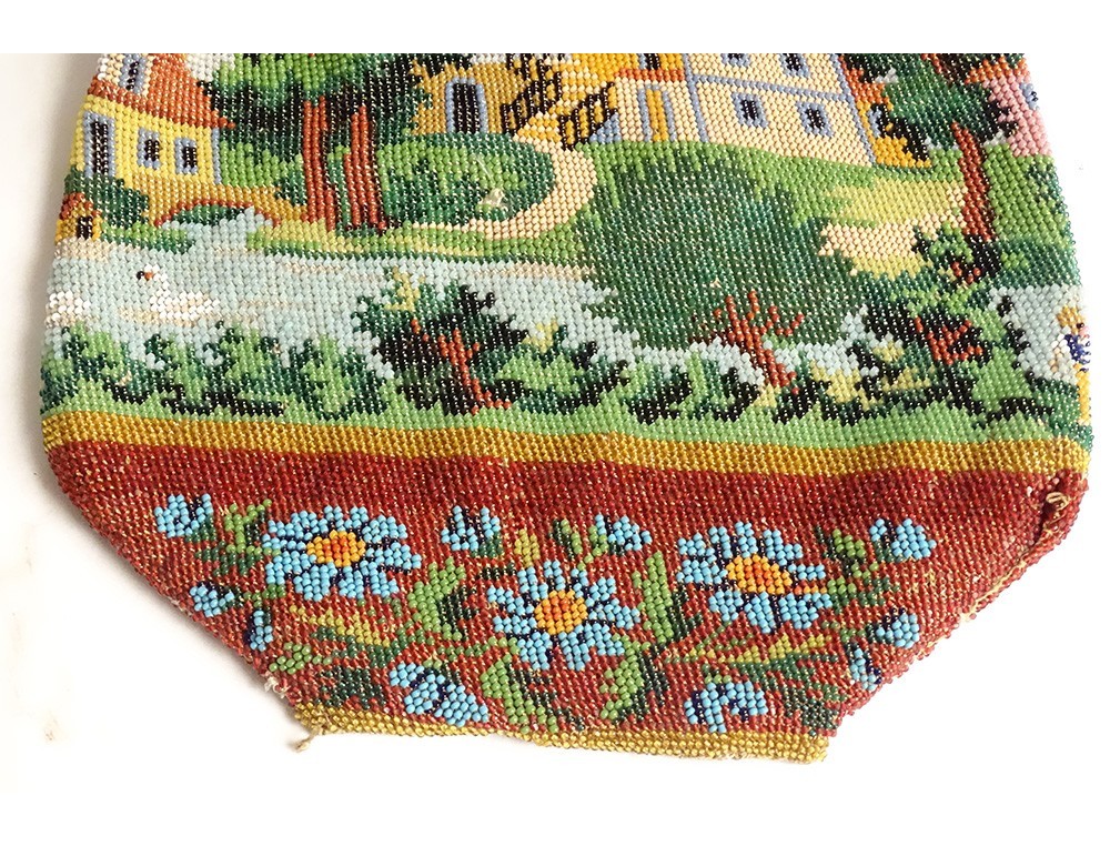 Small evening handbag or minaudière in pearl work representing riverside landscapes, with characters on a boat on one side, silver metal clasp, from the 19th century.