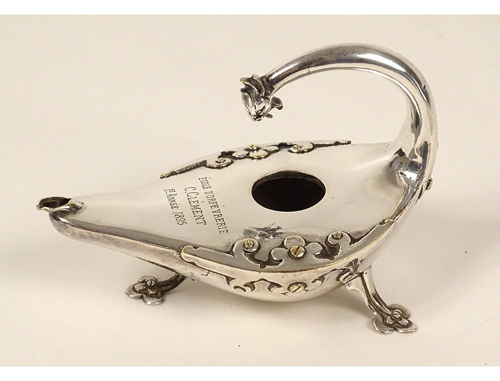 Oil lamp in silver metal, work of mastery or masterpiece of a student (C. Clément) of a school of goldsmithing, dated 1895, from the end of the 19th century.
