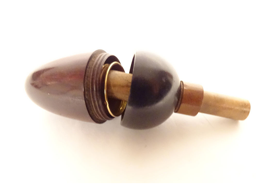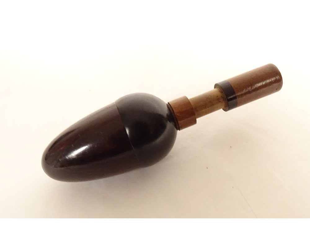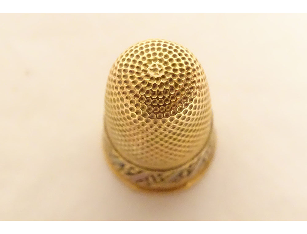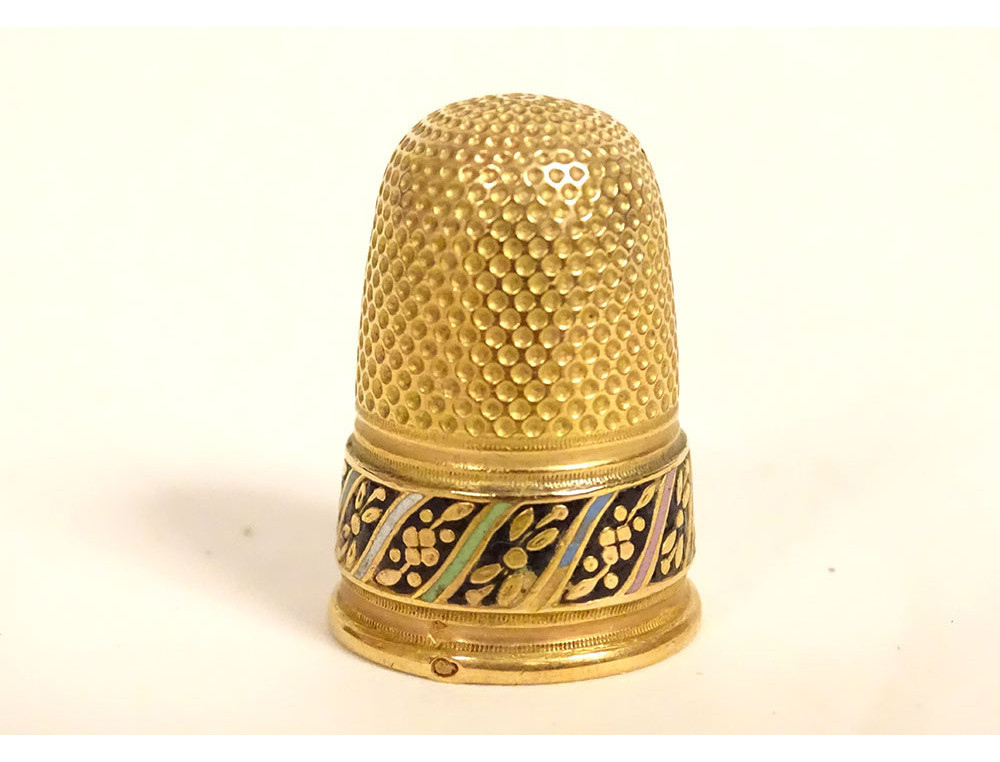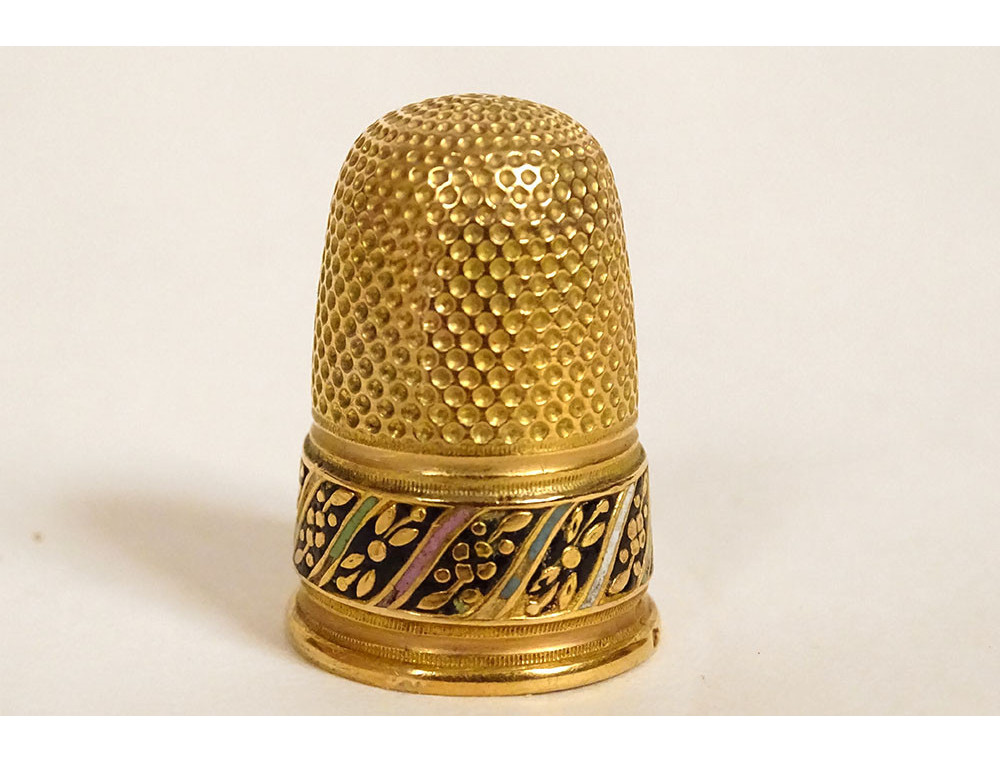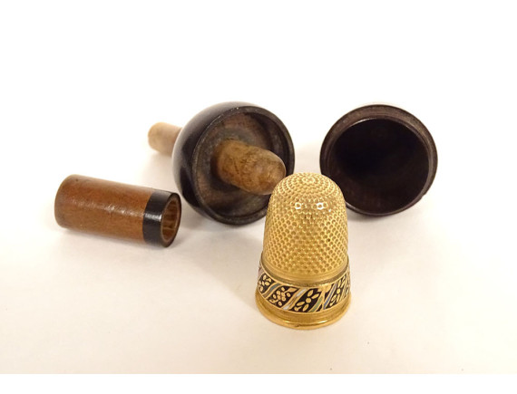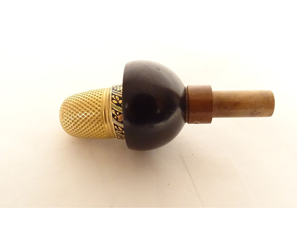 Finely chiseled and enamelled 18-carat solid gold thimble (eagle's head hallmark), in its small wooden acorn-shaped case also forming a needle case, from the 19th century.