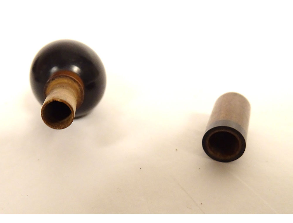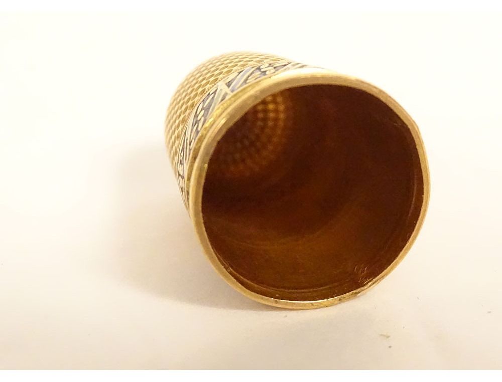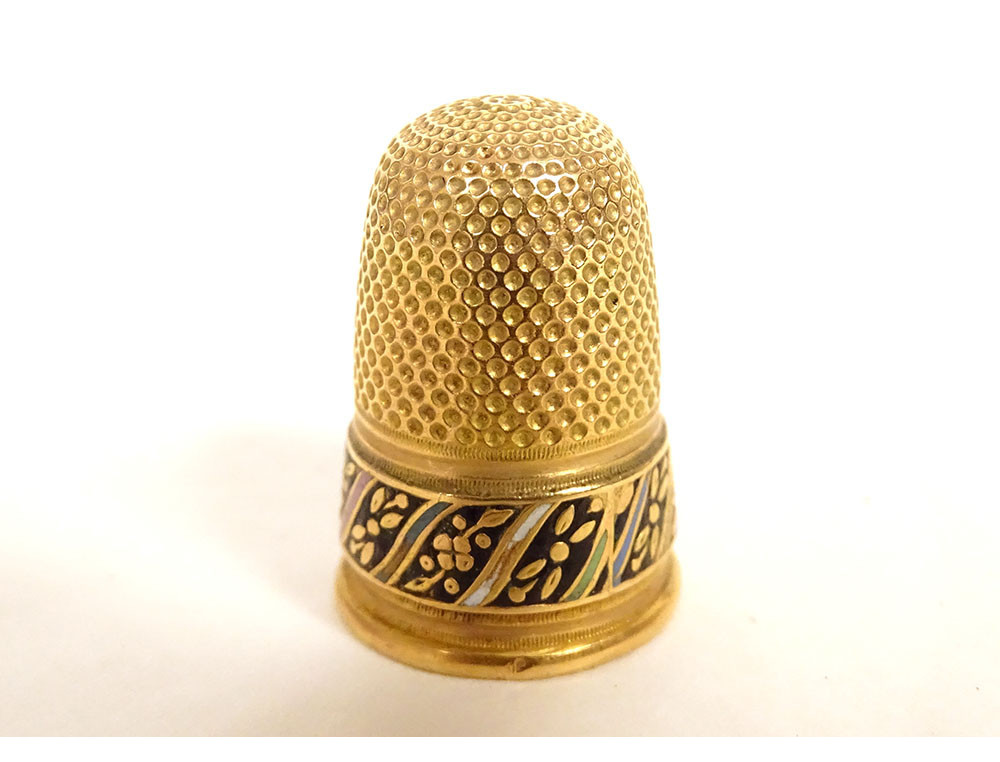 18K solid gold enameled thimble with wooden needle case and tassel 4.45g, 19th century