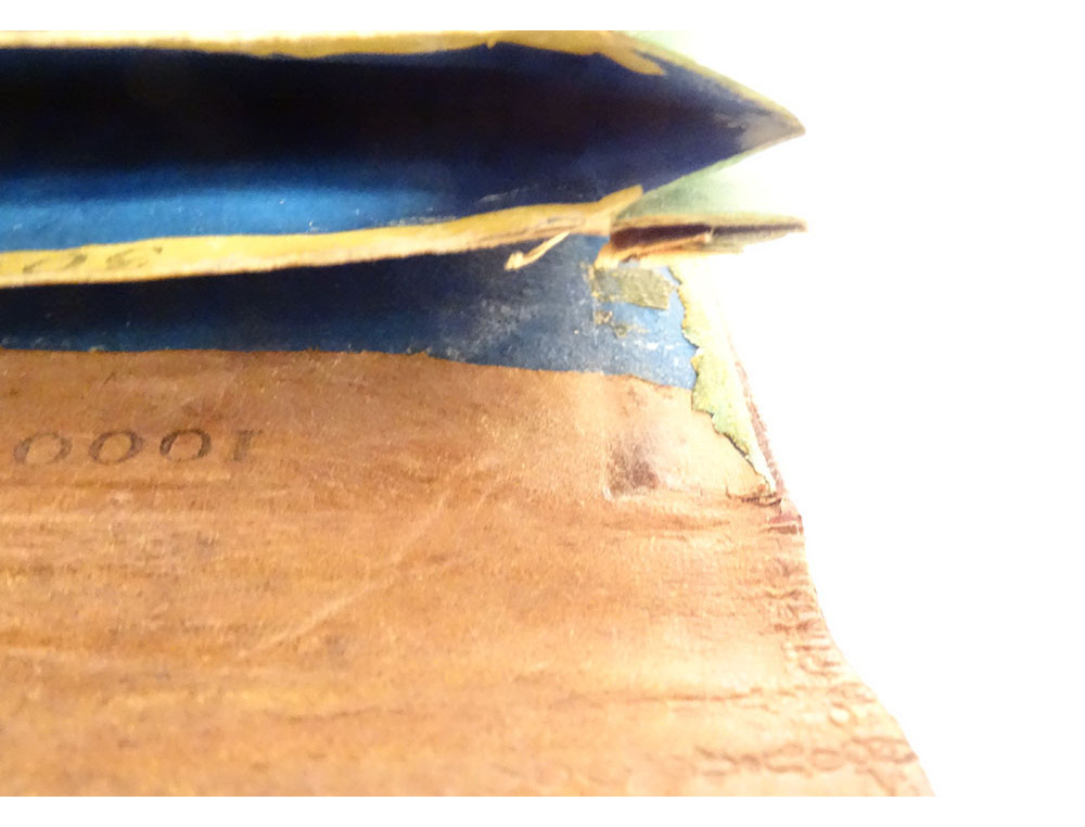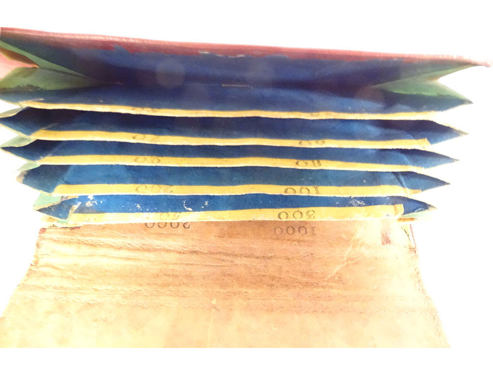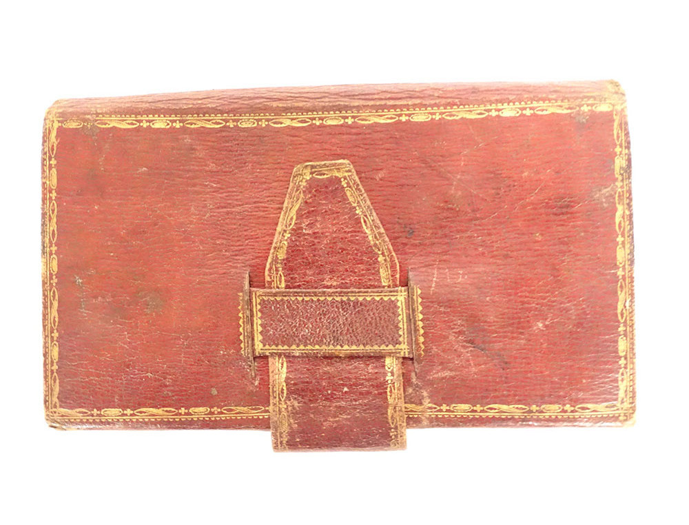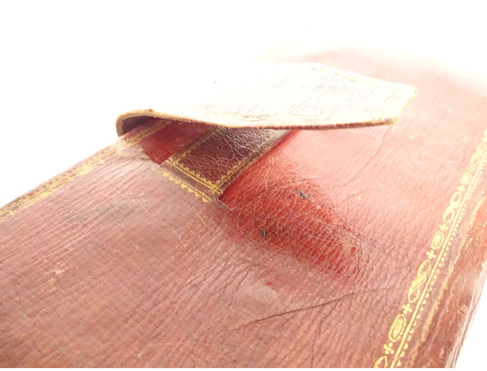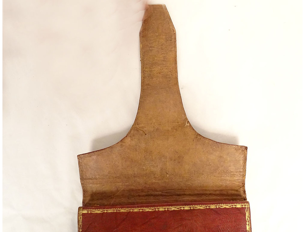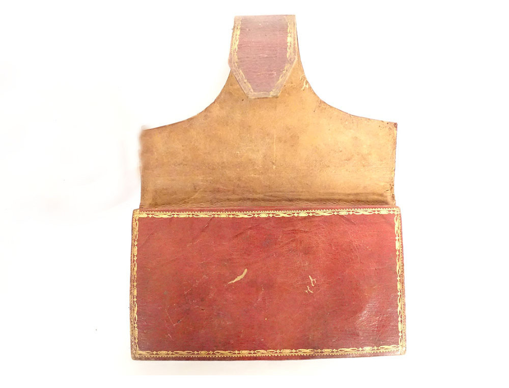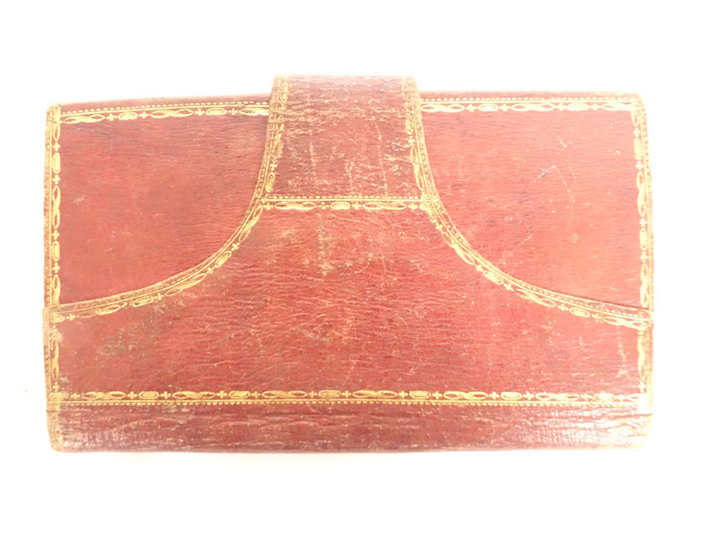 Small wallet or document holder with gussets, in red morocco leather gilded with iron, decorated with a fine stylized plant frieze, from the First Empire period, early 19th century.