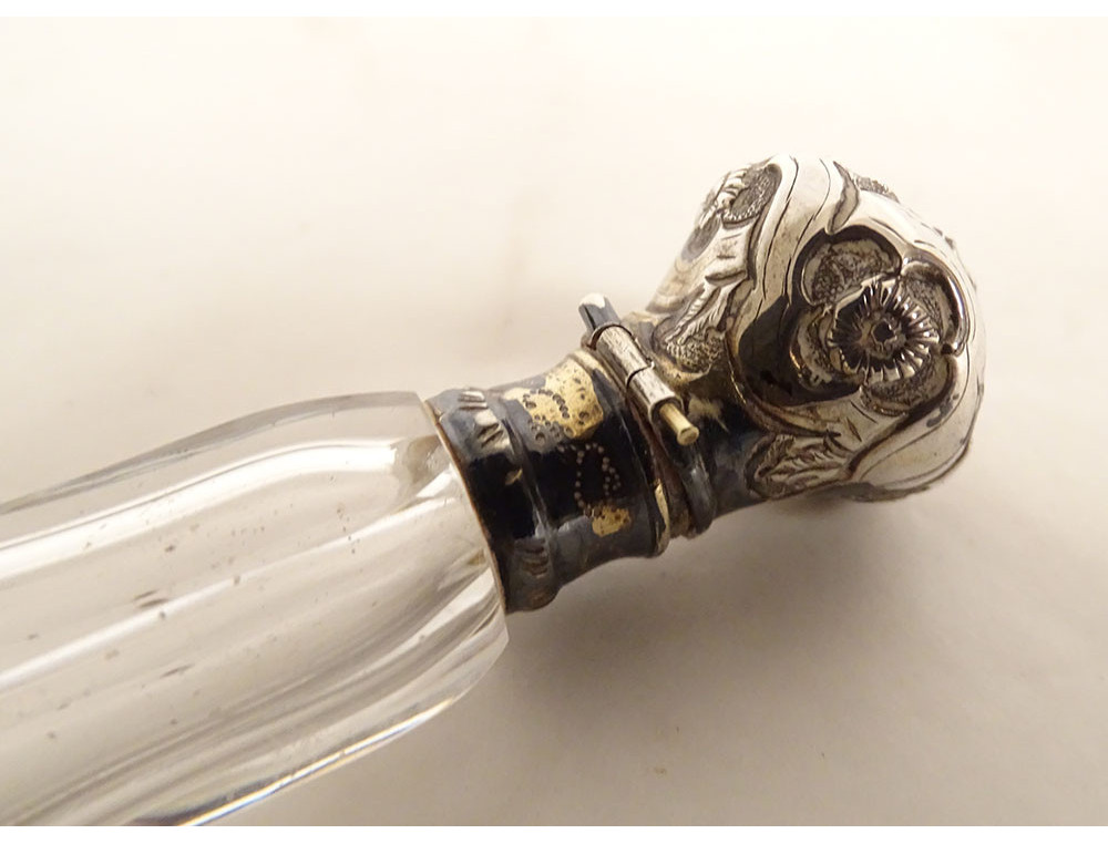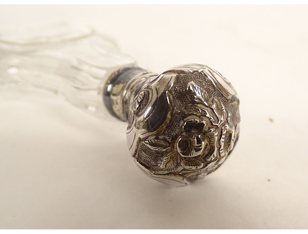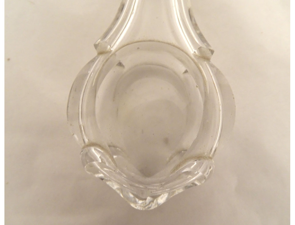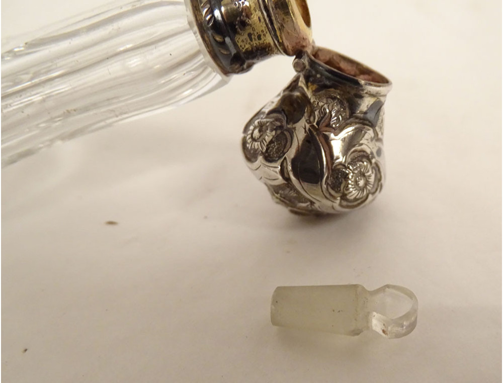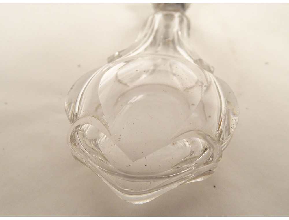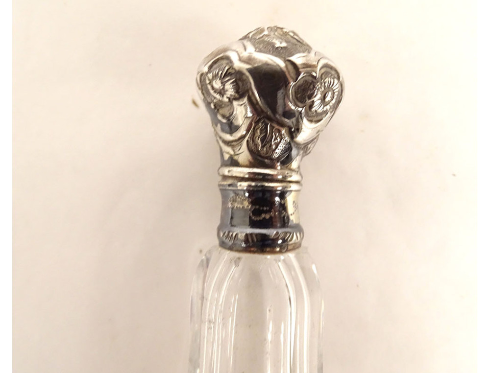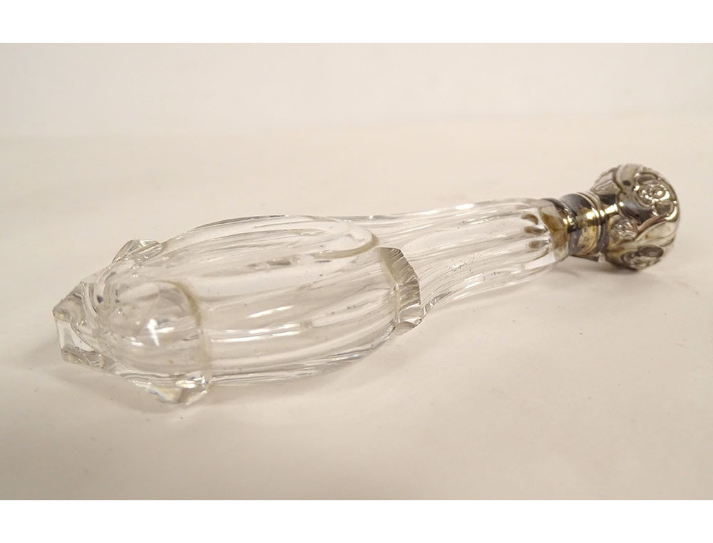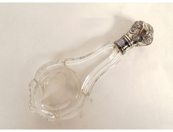 Salt bottle in cut crystal in the shape of a drop, solid silver frame chiseled with small flowers, 19th century period.