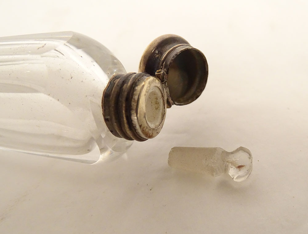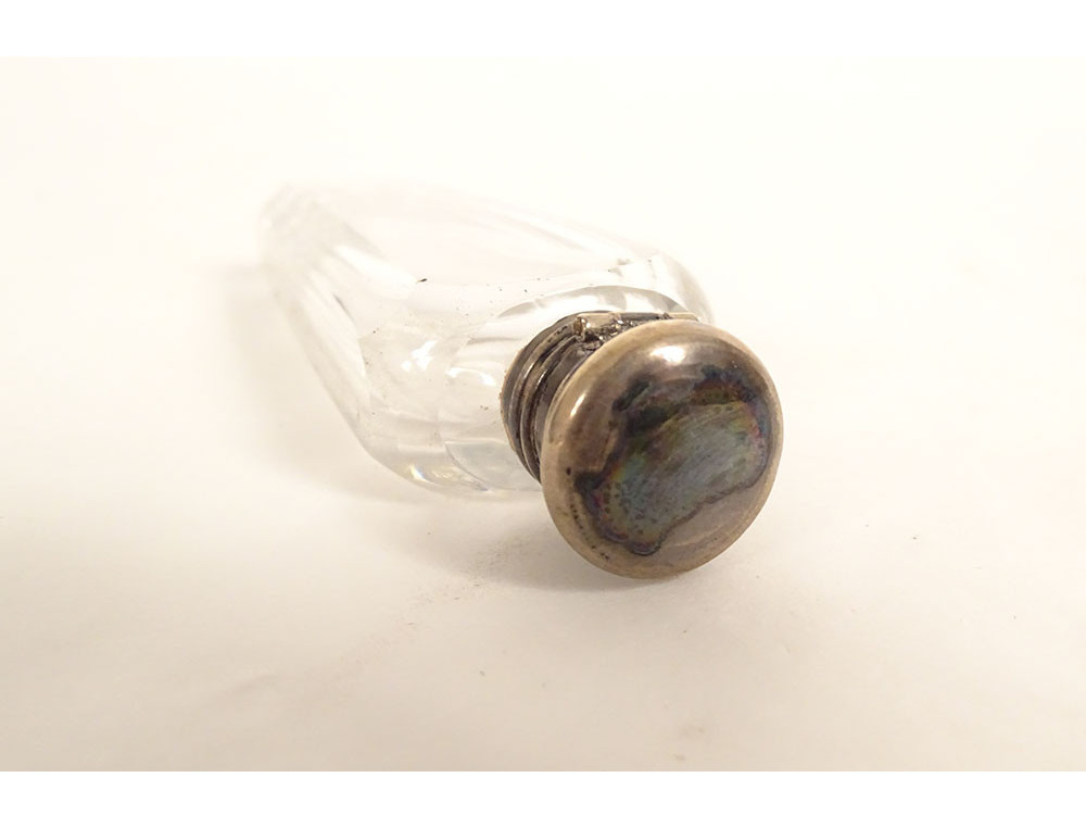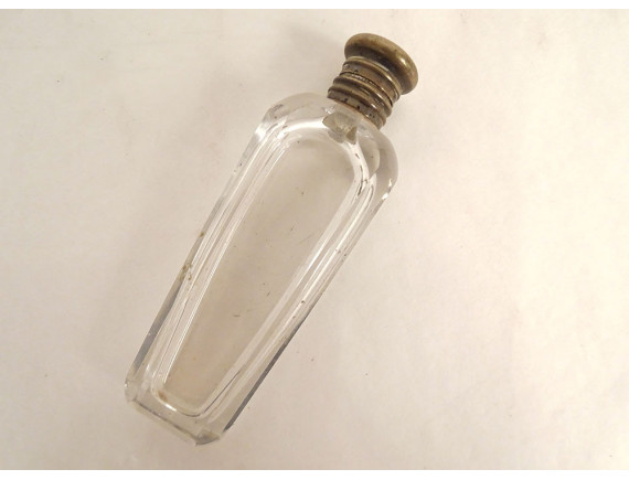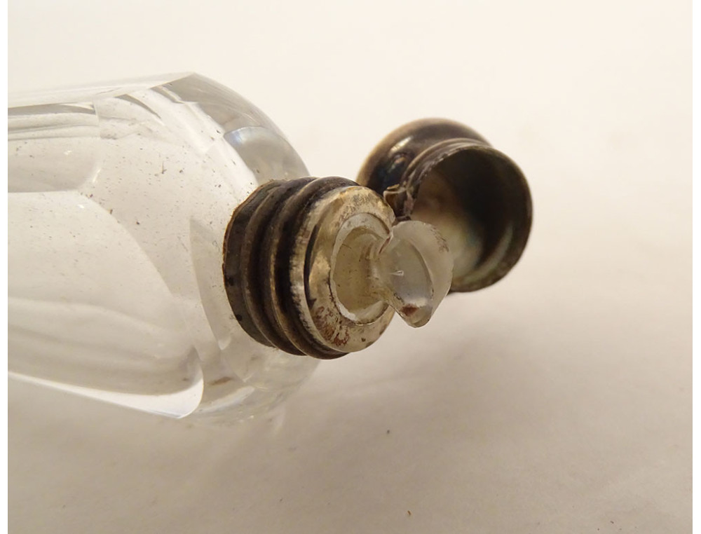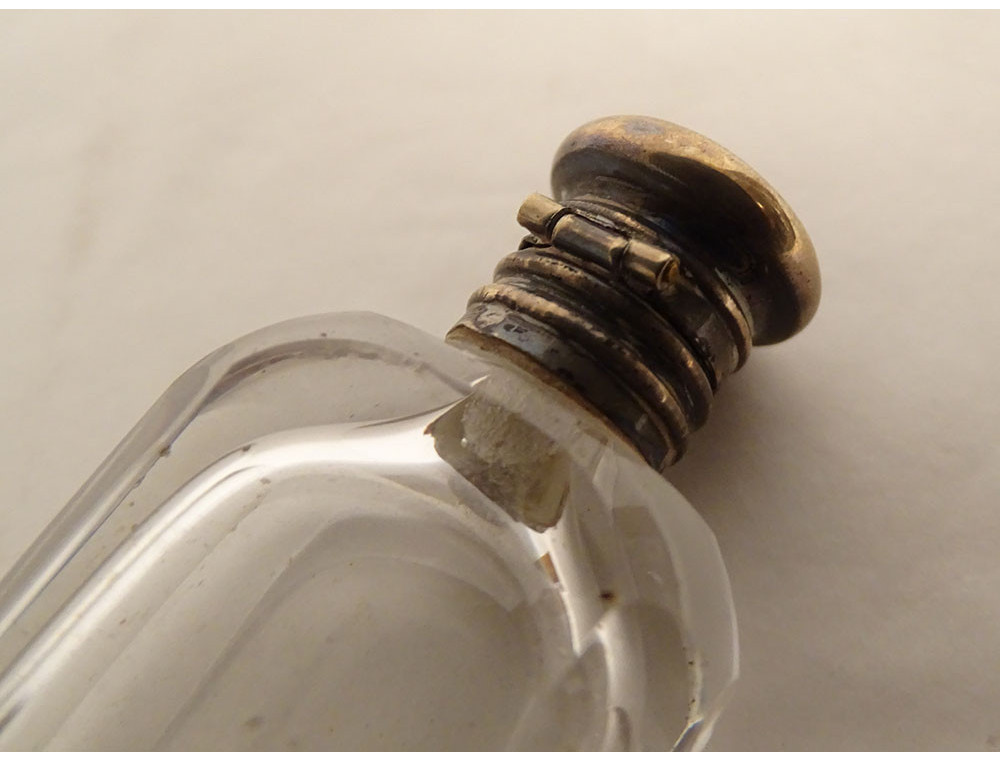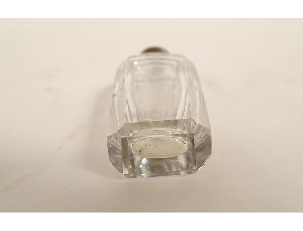 Salt bottle in cut crystal in the shape of a drop, solid silver frame chiseled with small flowers, 19th century period.