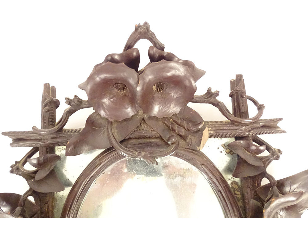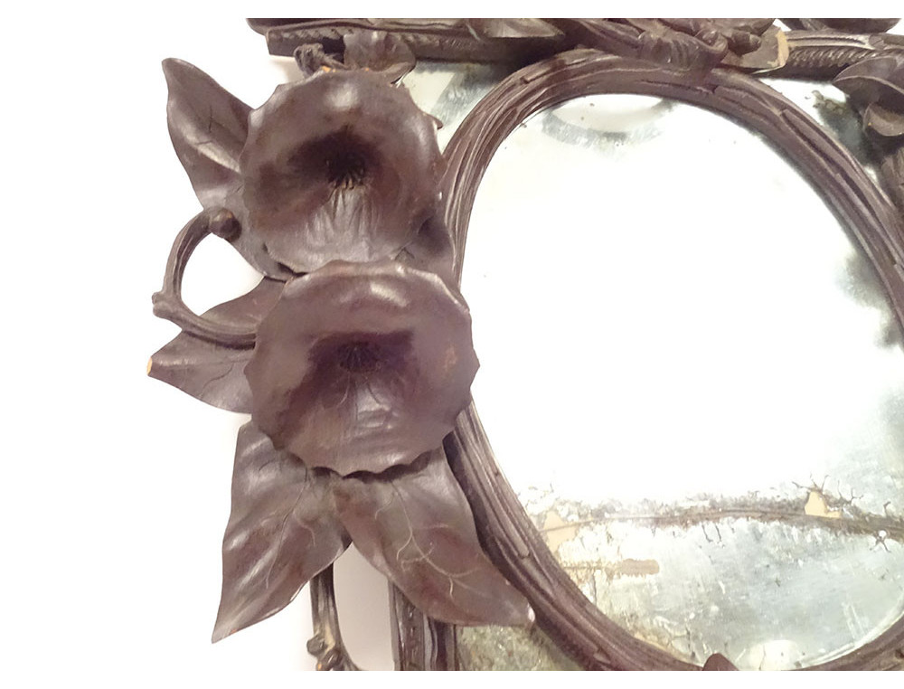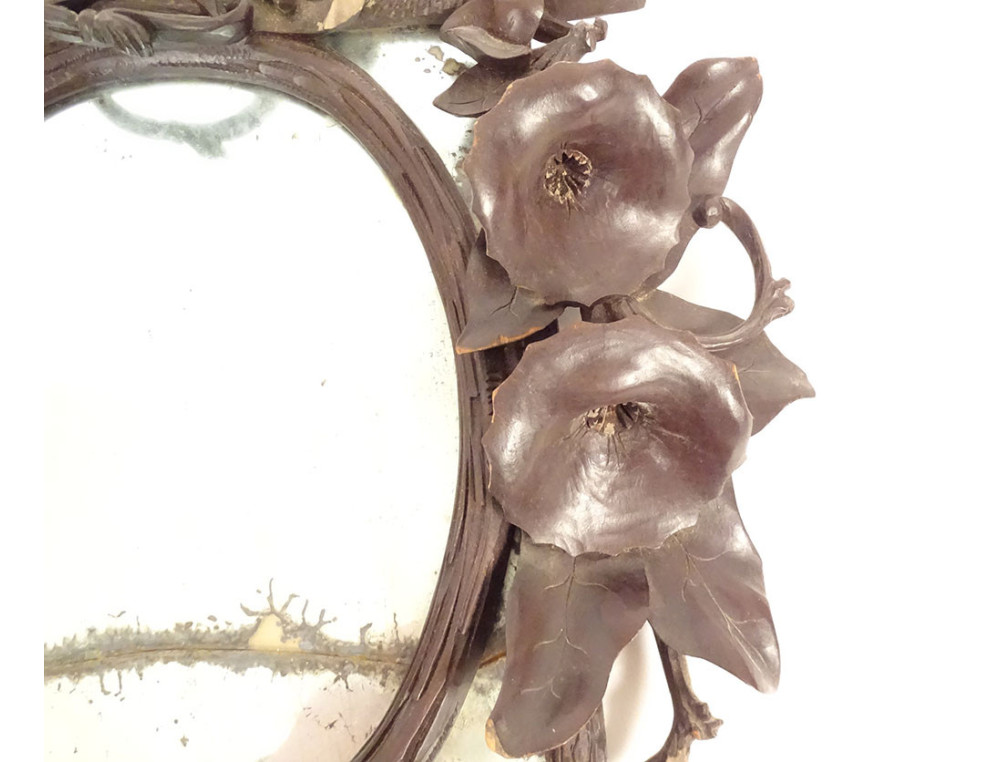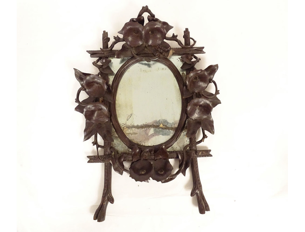 Black Forest carved wooden mirror* with rich decoration of flowers and bindweed foliage framing a rectangular (mercury) glass with a small oval wooden frame applied to it, dating from the 19th century.