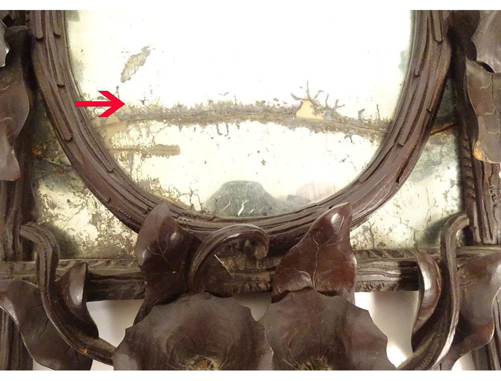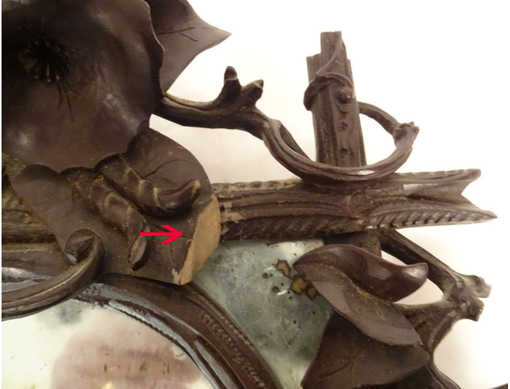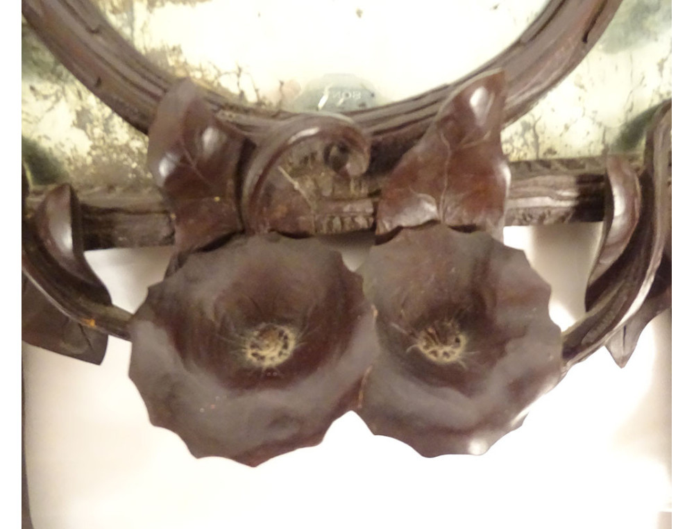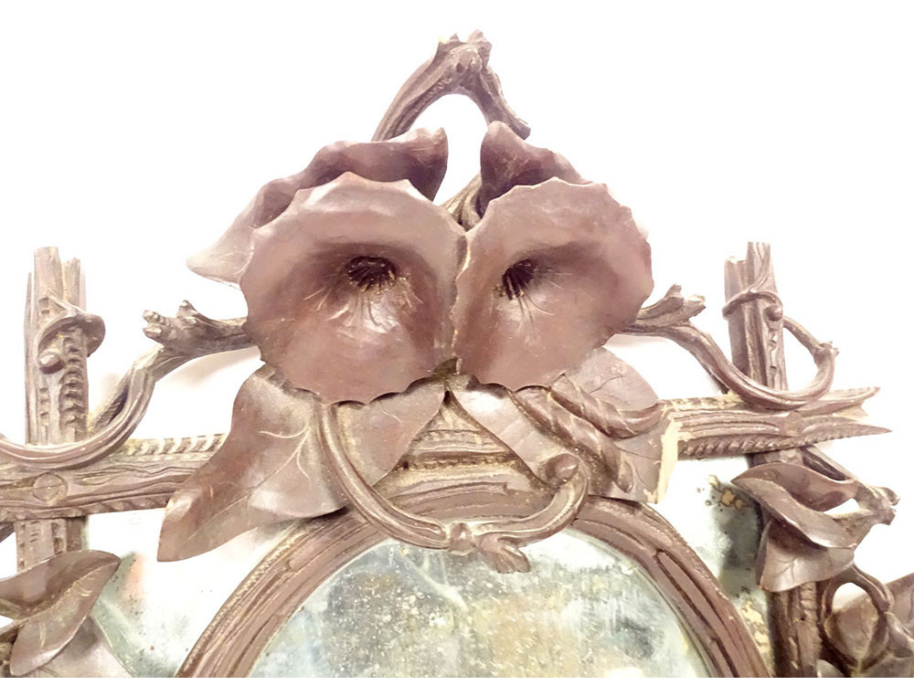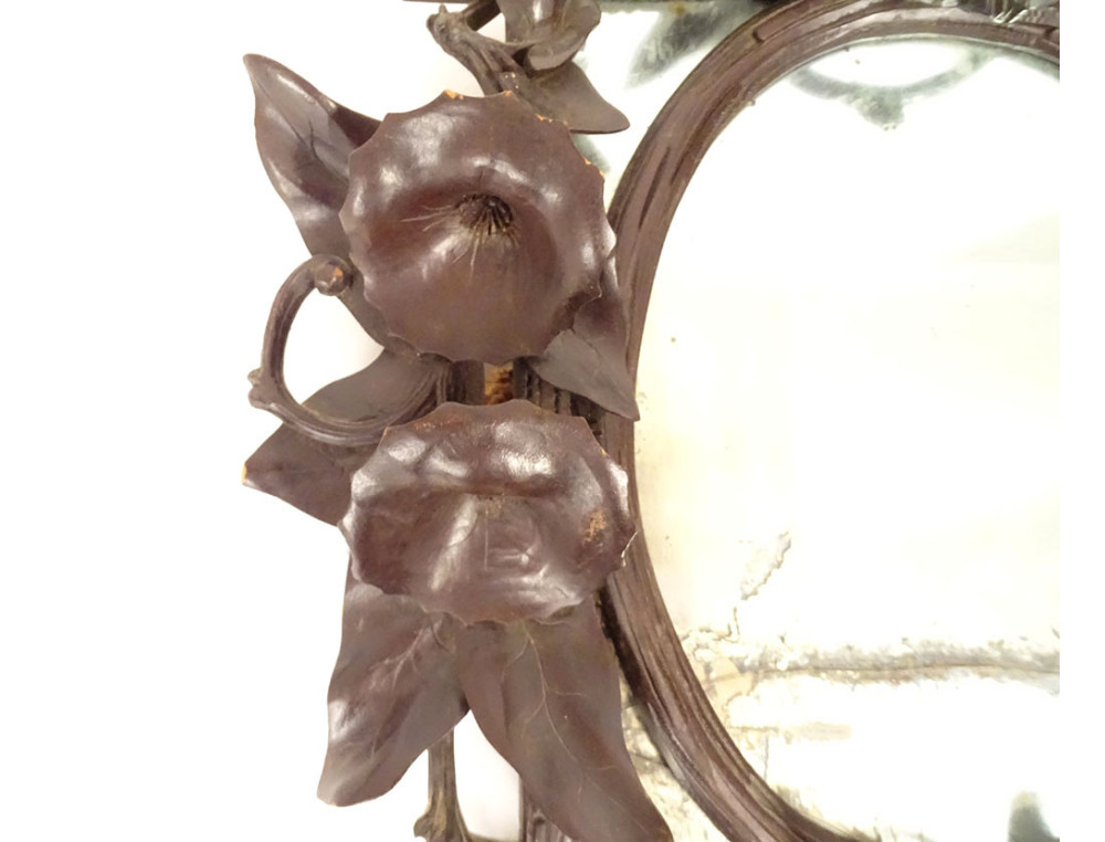 Black Forest carved wooden mirror* with rich decoration of flowers and bindweed foliage framing a rectangular (mercury) glass with a small oval wooden frame applied to it, dating from the 19th century.