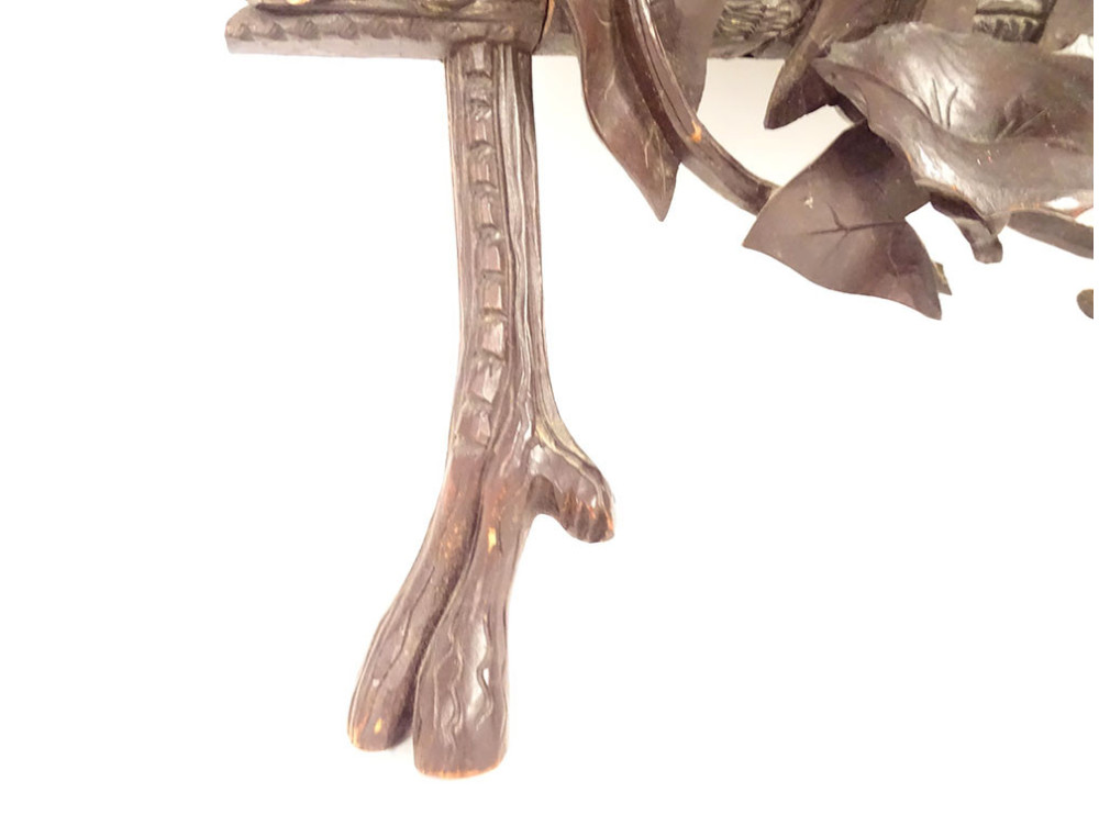 The carved wooden objects of the Black Forest did not originate in Germany but were made in the Brienz region of Switzerland. The tradition of woodworking is ancient in this area, and the inhabitants continue the practice of carving wood on house facades, furniture, and everyday objects. The carvers particularly excel at depicting wild animals in their natural habitat. In the 19th century, these naturalistic Black Forest carvings became very fashionable and highly prized.
