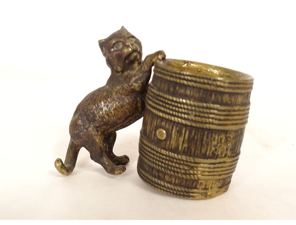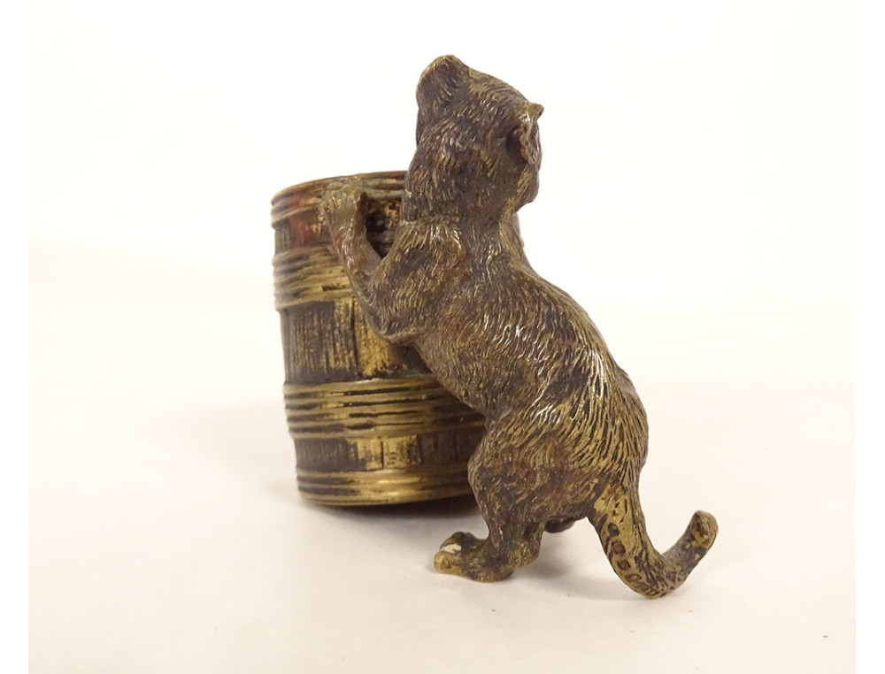 Small bronze match holder/lighter depicting a playful cat playing near a barrel, signed (see photos), 19th century.