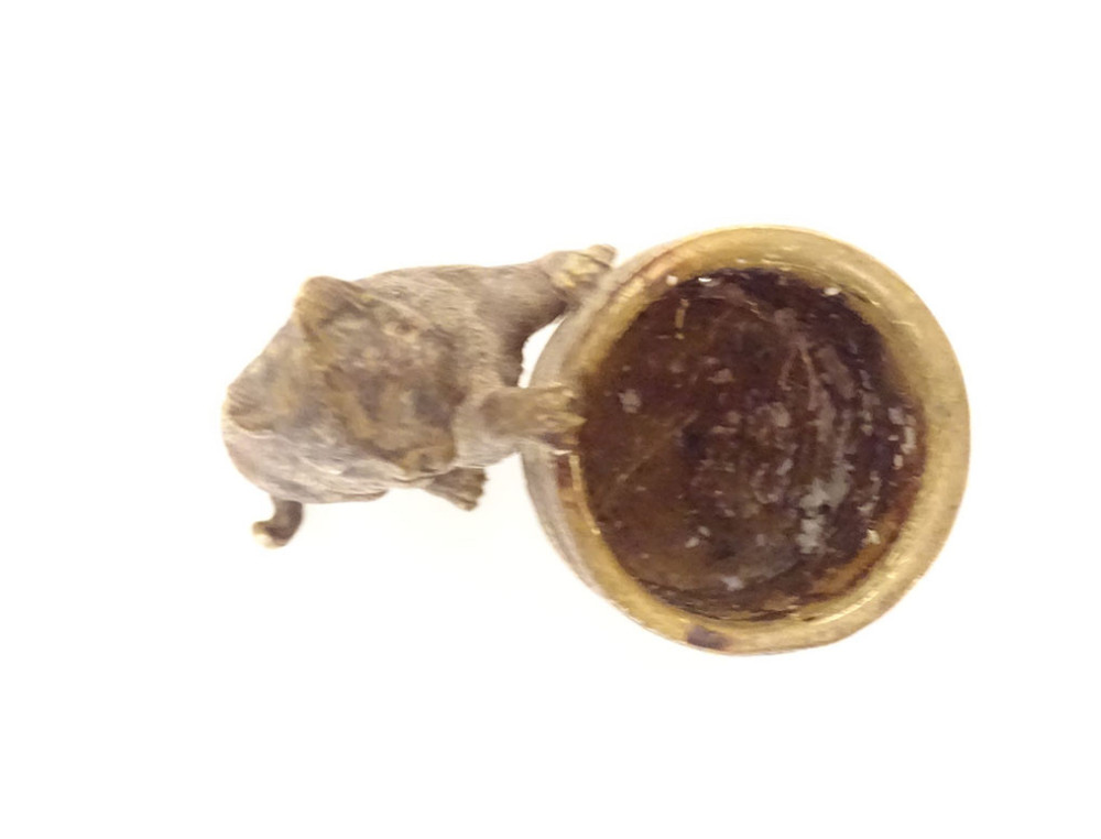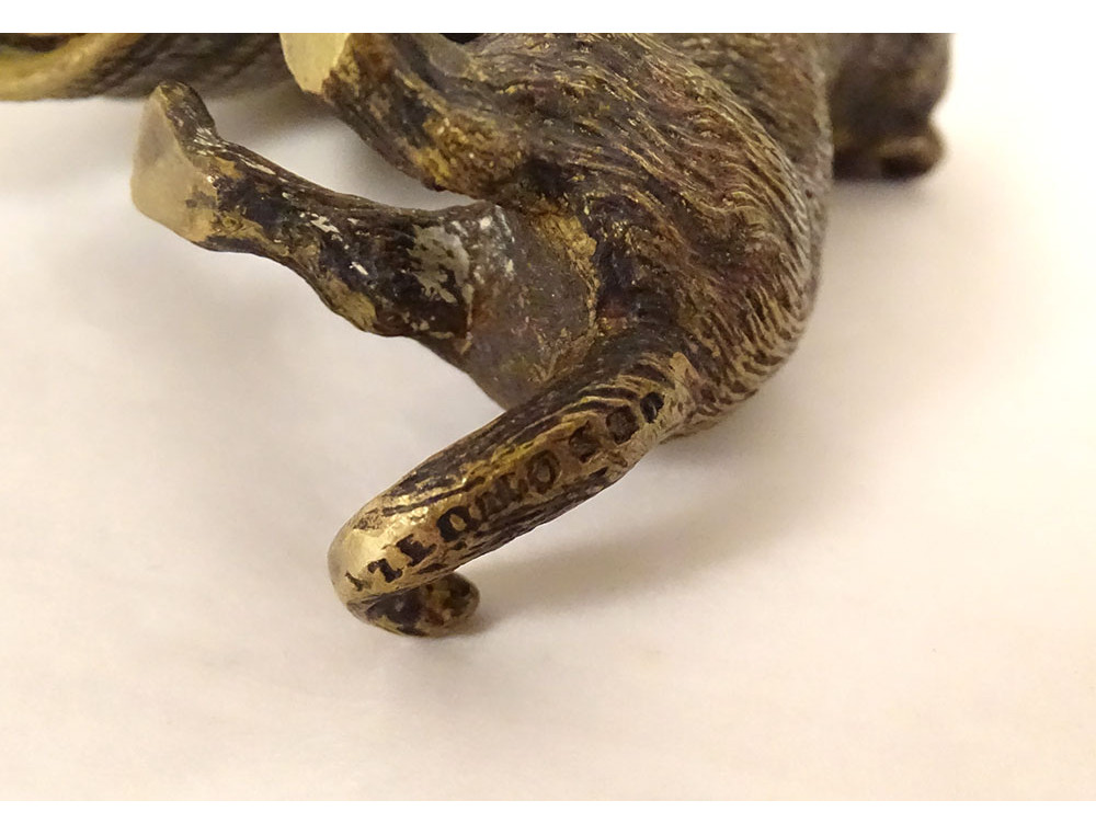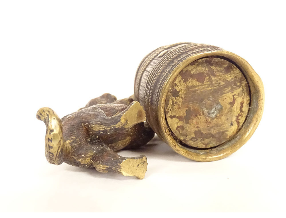 Small bronze match holder/pitonner in the shape of a cat in a barrel, signed 19th century