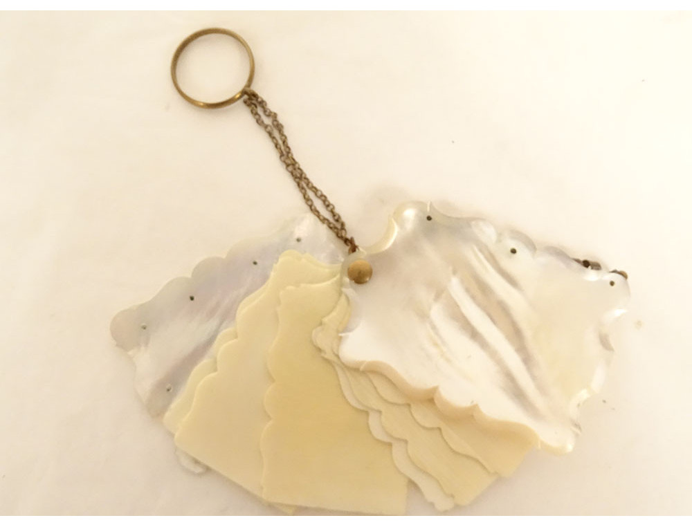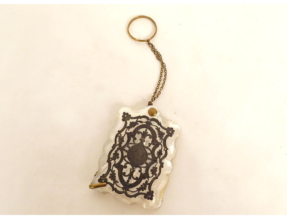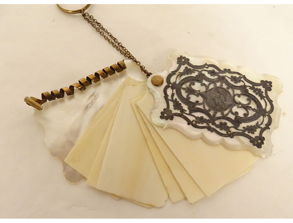 Small dance card in mother-of-pearl and silver-plated metal ornamentation decorated with vegetal scrolls and arabesques, and small flowers surrounding a monogram, interior plaques in (ox) bone, from the Napoleon III period, 19th century.