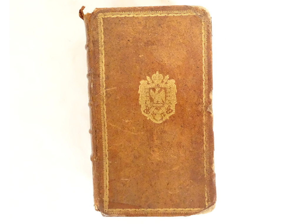 Book with secret compartment and music box, entitled "Abrégé Chronologique de l'Histoire Ecclésiastique" in Paris 1751, leather cover decorated with coat of arms with a crowned shield, inside a Thorens brand music box (Harry Lime Theme), from the 18th century.